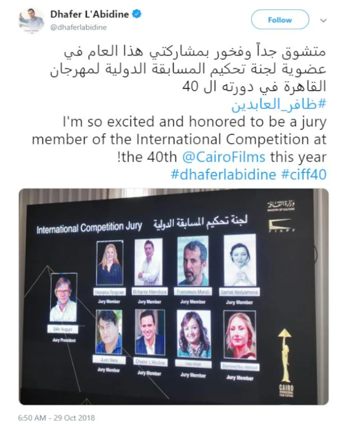 يُذكر أنّ رئيس المهرجان محمد حفظي أعلن بالأمس التشكيل الكامل للجنة تحكيم المسابقة الدولية بالدورة الـ 40 من مهرجان القاهرة السينمائي، الذي تنطلق فعالياته في الفترة من 20 إلى 29 نوفمبر المقبل، وتضمّن بجوار ظافر العابدين، الممثلة اللبنانية ديامان بو عبود الفائزة بأحسن ممثلة من مهرجان القاهرة في دورته الماضية، والمخرجة المصرية هالة خليل.