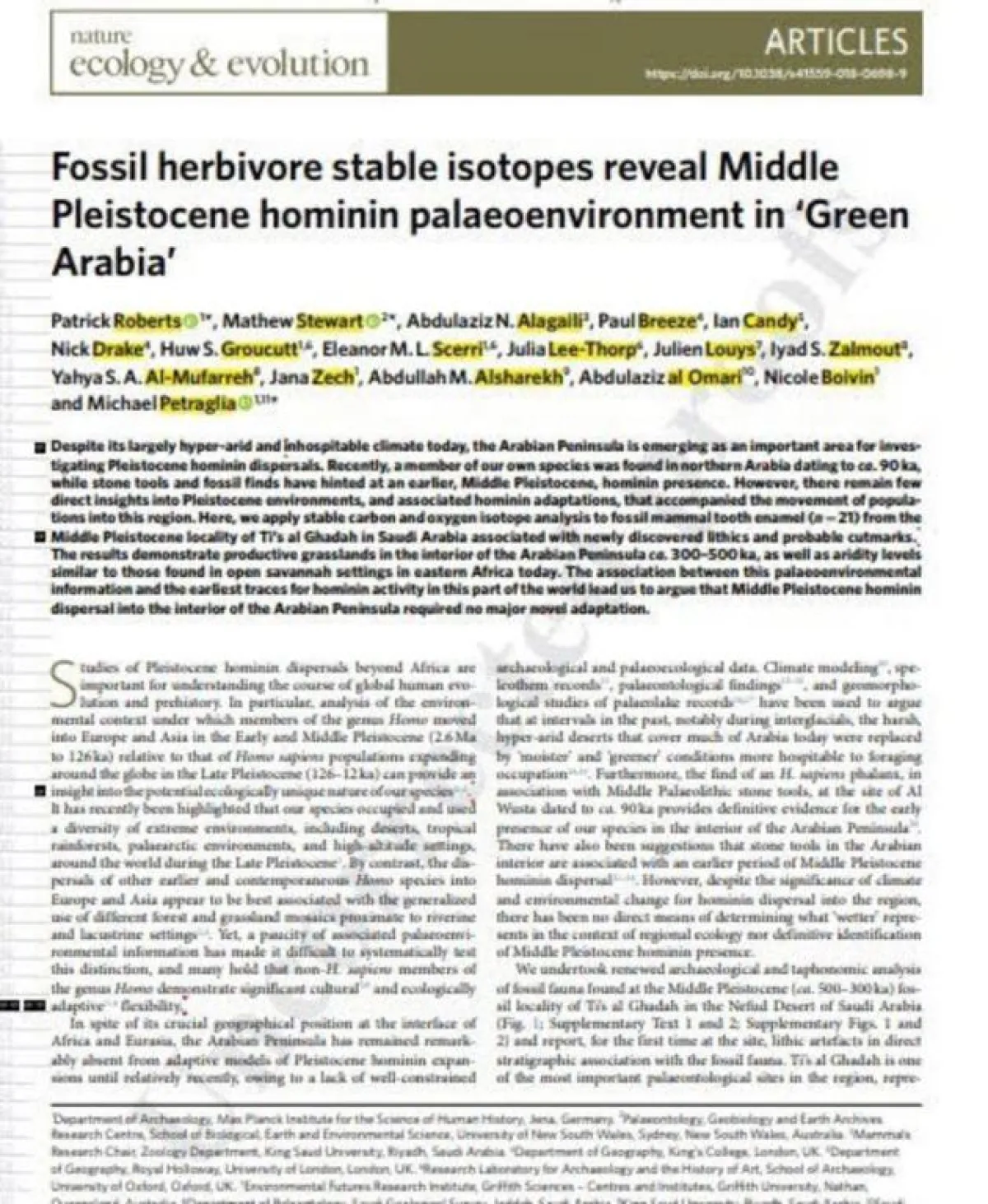 نشرت مجلة Nature Evolution and Ecology العالمية المتخصصة في دراسات العلوم الطبيعية، أمس الاثنين، بحثاً علمياً، أعدَّه فريق "مشروع الجزيرة العربية الخضراء" الذي تنفذه الهيئة العامة للسياحة والتراث الوطني، بالمشاركة مع جامعة الملك سعود وهيئة المساحة الجيولوجية.