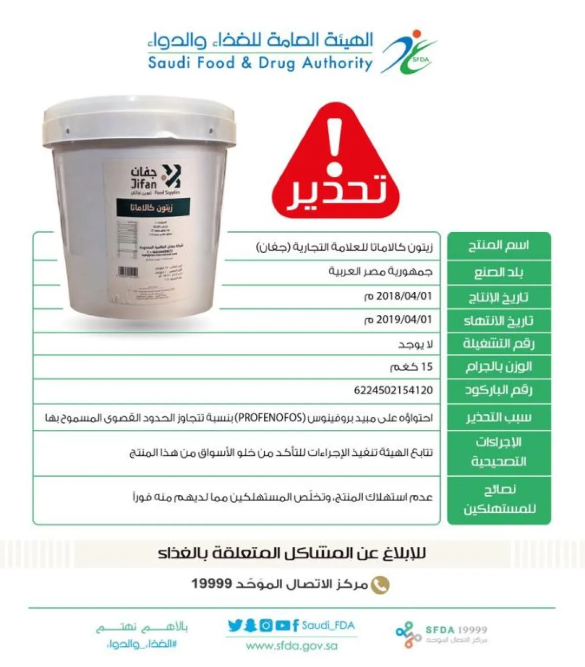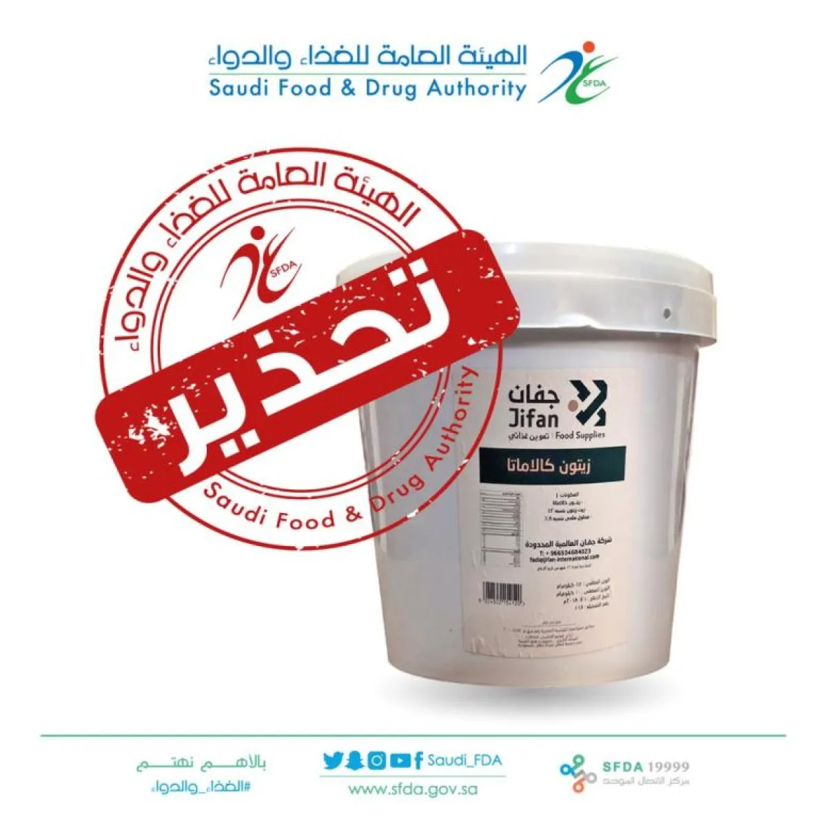 تعمل الهيئة العامة للغذاء والدواء السعودية على ضمان صحة المستهلكين، سواء في الأطعمة التي يتناولونها، أو الأدوية التي يستخدمونها، وذلك عبر التحقيق المستمر، وسحب المنتجات، أو الأدوية غير الصالحة من السوق، والتحذير منها. ومؤخراً حذَّرت الهيئة من شراء أو استهلاك منتج "زيتون كالاماتا" للعلامة التجارية "جفان" المُنتج في مصر.