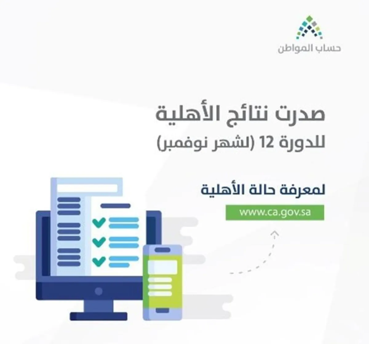 أعلن برنامج "حساب المواطن" عن صدور نتائج الأهلية للدورة الثانية عشرة لشهر نوفمبر 2018 المقبل.