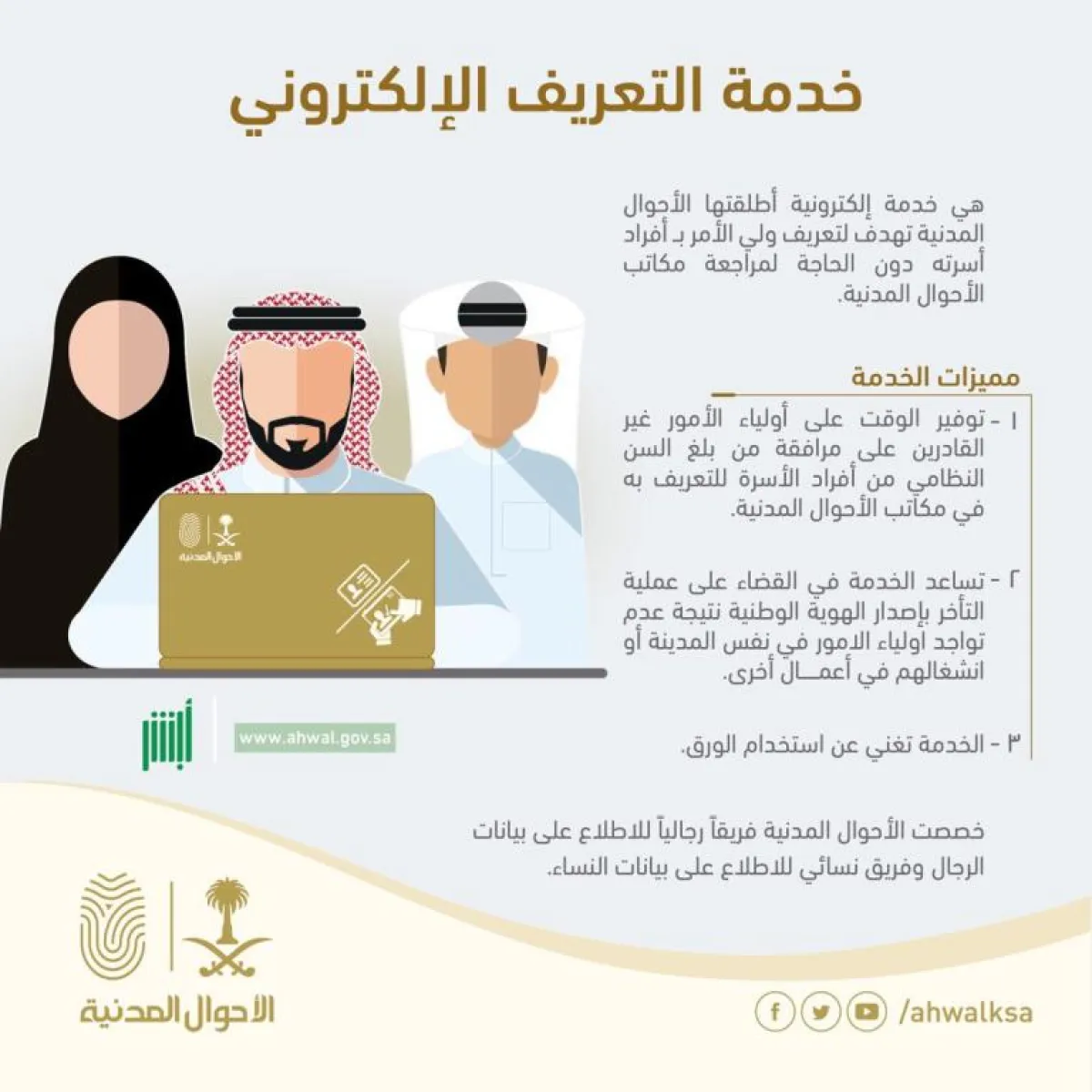 · توفير الوقت على أولياء الأمور غير القادرين على مرافقة مَن بلغ السن النظامية من أفراد الأسرة للتعريف به في مكاتب الأحوال المدنية.