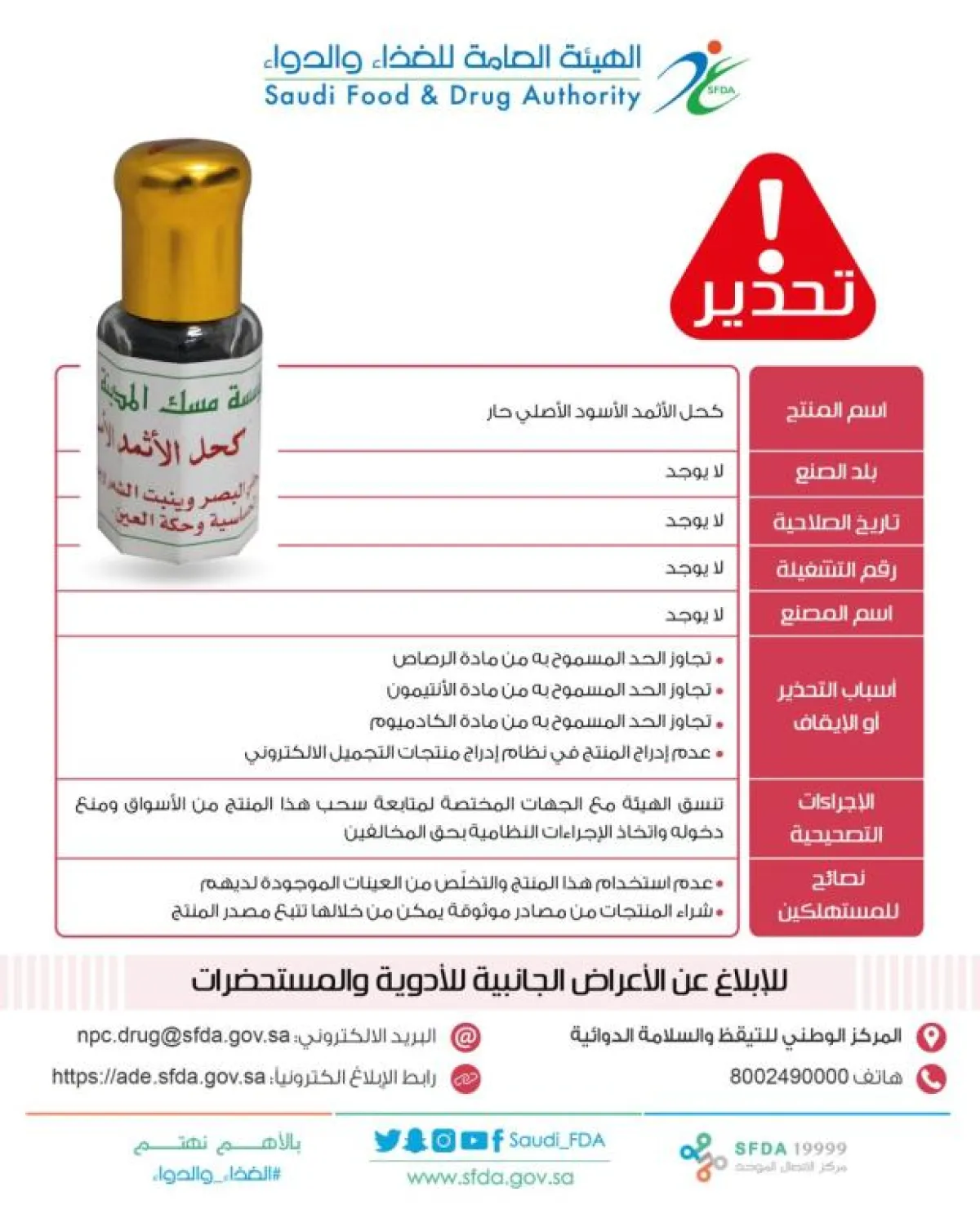 حذّرت الهيئة العامة للغذاء والدواء المستهلكين من استخدام 4 منتجات كحل عيون لاحتوائها على نسب عالية من "الرصاص والأنتيمون والكادميوم"، تجاوزت الحد المسموح به.