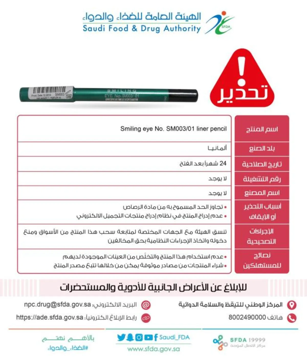 وأشارت، إلى أن المنتج الأول يحمل اسم "Ever beauty Eye & lip pencil" مصنّع في الصين بتاريخ صلاحية 12 شهراً بعد الفتح، في حين أن المنتج الثاني يحمل اسم "Smiling eye No. SM003/01 liner pencil" مصنّع في ألمانيا بتاريخ صلاحية 24 شهراً بعد الفتح.