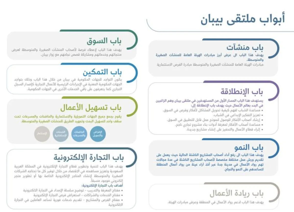 ويضم ملتقى بيبان مكة 8 أبواب تفتح للزوار آفاقًا في المعرفة وريادة الأعمال وهي: (باب منشآت، باب الانطلاقة، وباب النمو، وباب ريادة الأعمال، وباب السوق، وباب التمكين، وباب تسهيل الأعمال إضافة إلى باب التجارة الإلكترونية الذي استُحدث مؤخرًا والذي يقدم ورشَ عملٍ من قِبل خبراء في مجالات التجارة الإلكترونية مع توفير الخدمات المساندة لهذه التجارة الحديثة من توصيلٍ ومدفوعاتٍ وغيرها.
