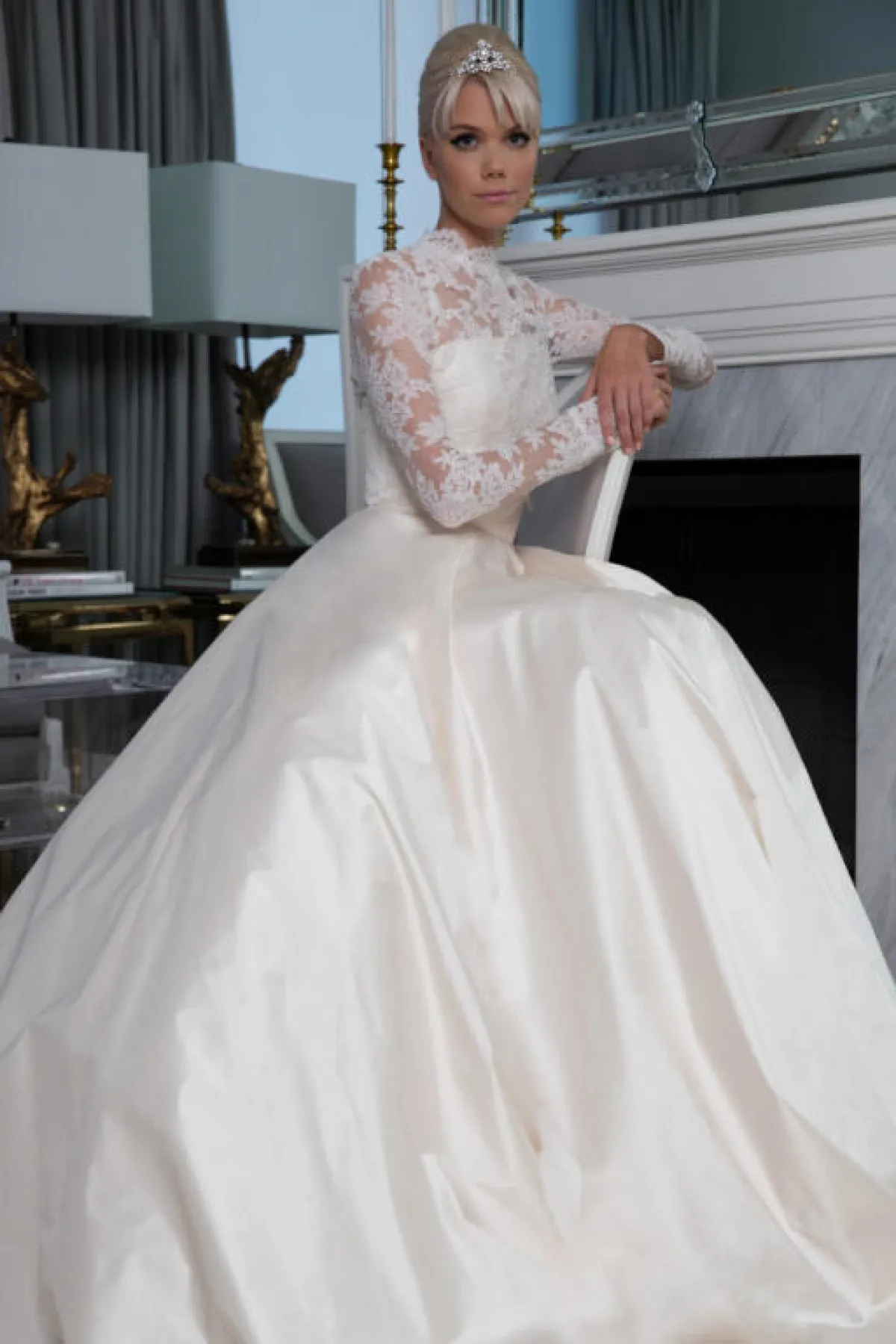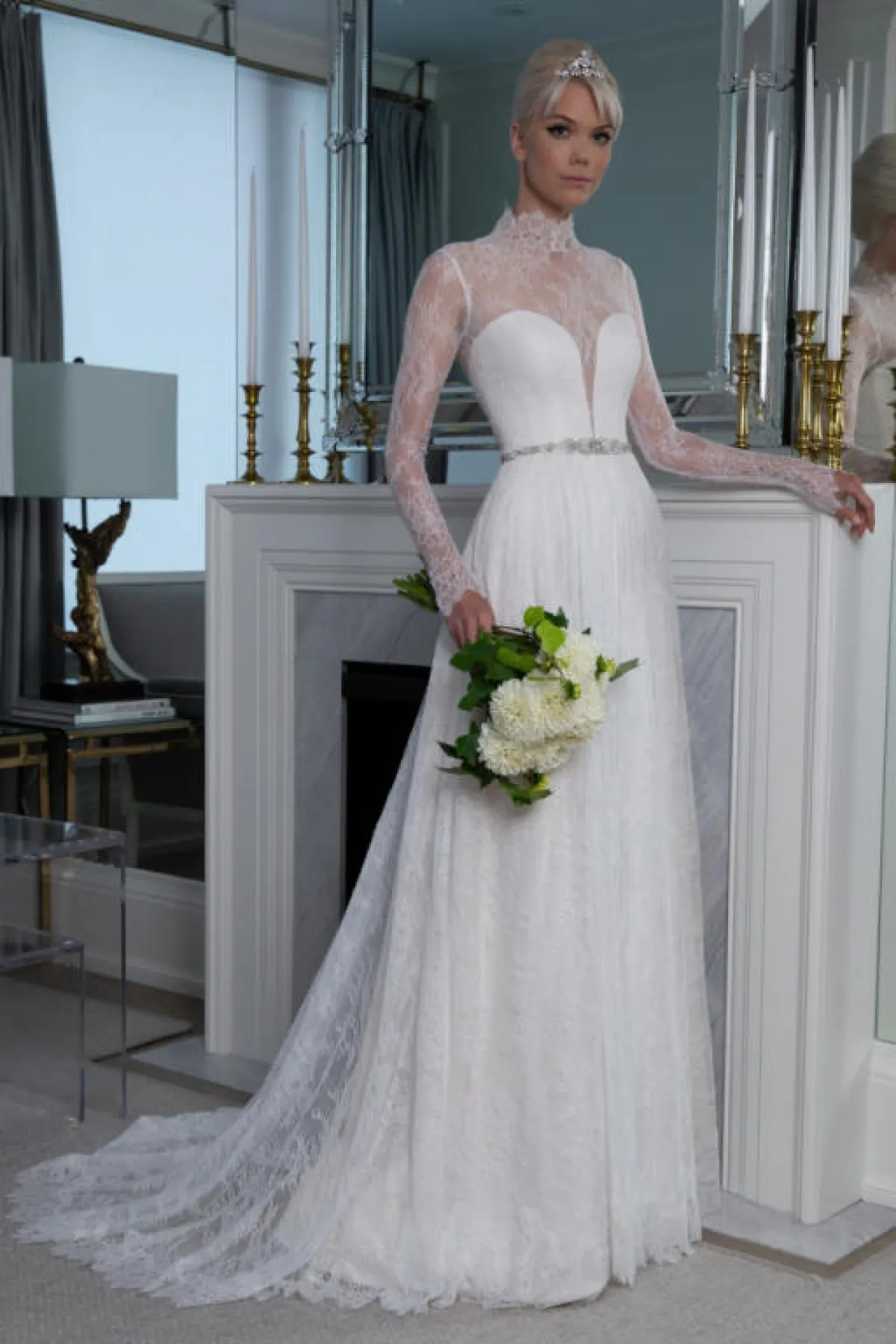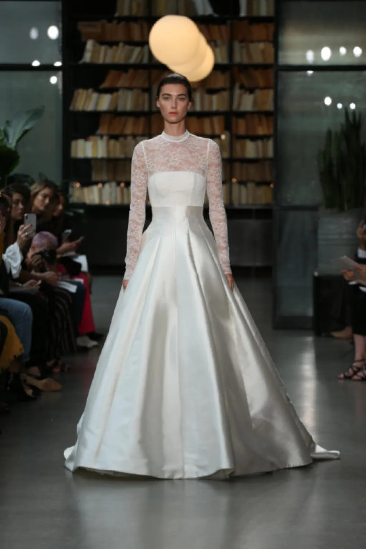 كما برزت الفساتين بالياقة المرتفعة مع الأكمام الدانتيل الشفّافة في العديد من الموديلات الجذابة، سواء بالتنورة المنفوشة Ball Gown، أو القصّات الواسعة قليلاً من أسفل مثل فساتين Amsale، Legends Romona Keveza، Sarah Jassir، وGracy Accad، والفستان بالأكمام الشفافة من Dany Mizrachi.