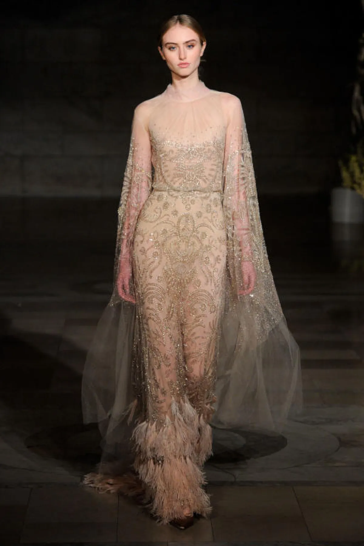 وقدمت المصممة ريم عكرا Reem Acra فستان زفاف نيود مزين بتطريزات برّاقة مع صيحة الكاب التول والياقة المرتفعة بتصميم يجمع بين الرقي والفخامة.