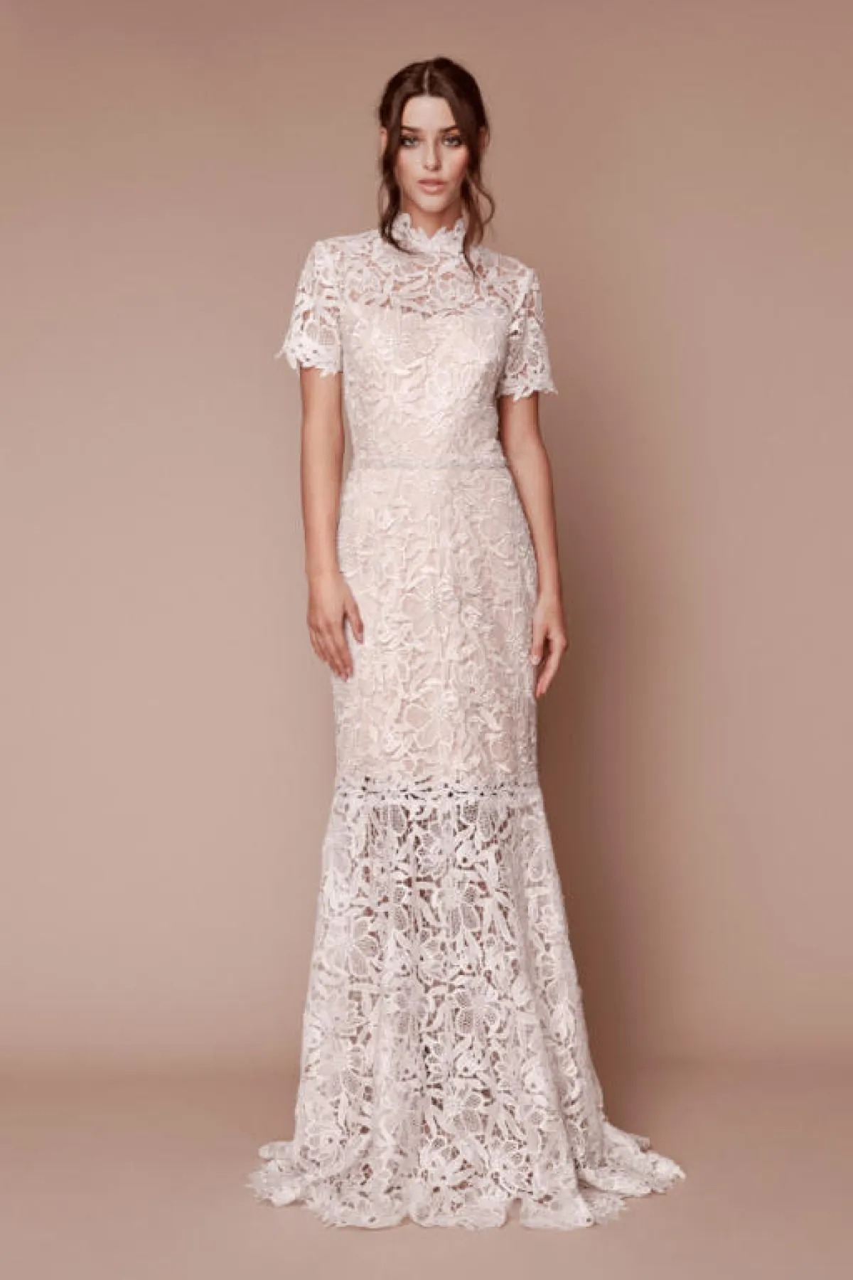 ويمكن أن يكون الفستان بياقة مرتفعة مع أكمام قصيرة مثل فساتين جورج حبيقة Georges Hobeika، طوني ورد Tony Ward، وتاداشي شوجي Tadashi Shoji.
