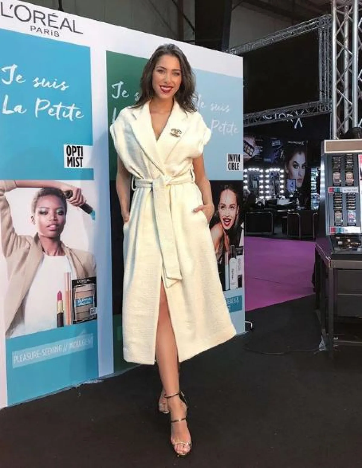 دانييلا رحمة اختارت الأبيض على فستان ميدي بقصة المعطف من دون أكمام، له حزام قماشي على الخصر، وقد زينته ببروش من الكريستال من “شانيل” Chanel وأكملت اللوك بصندل بكعب عالٍ باللون الفضي.