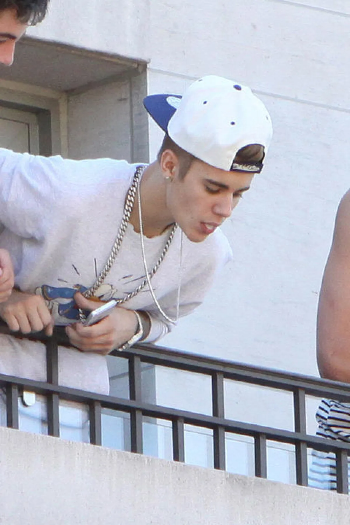 فعندما كان Bieber يقف على شرفة غرفته في أحد فنادق تورونتوـ كندا، واحتشد عدد كبير من المعجبين تحت الشرفة، التقطت عدسات الكاميرات صوراً له، وهو يبصق على معجبيه.