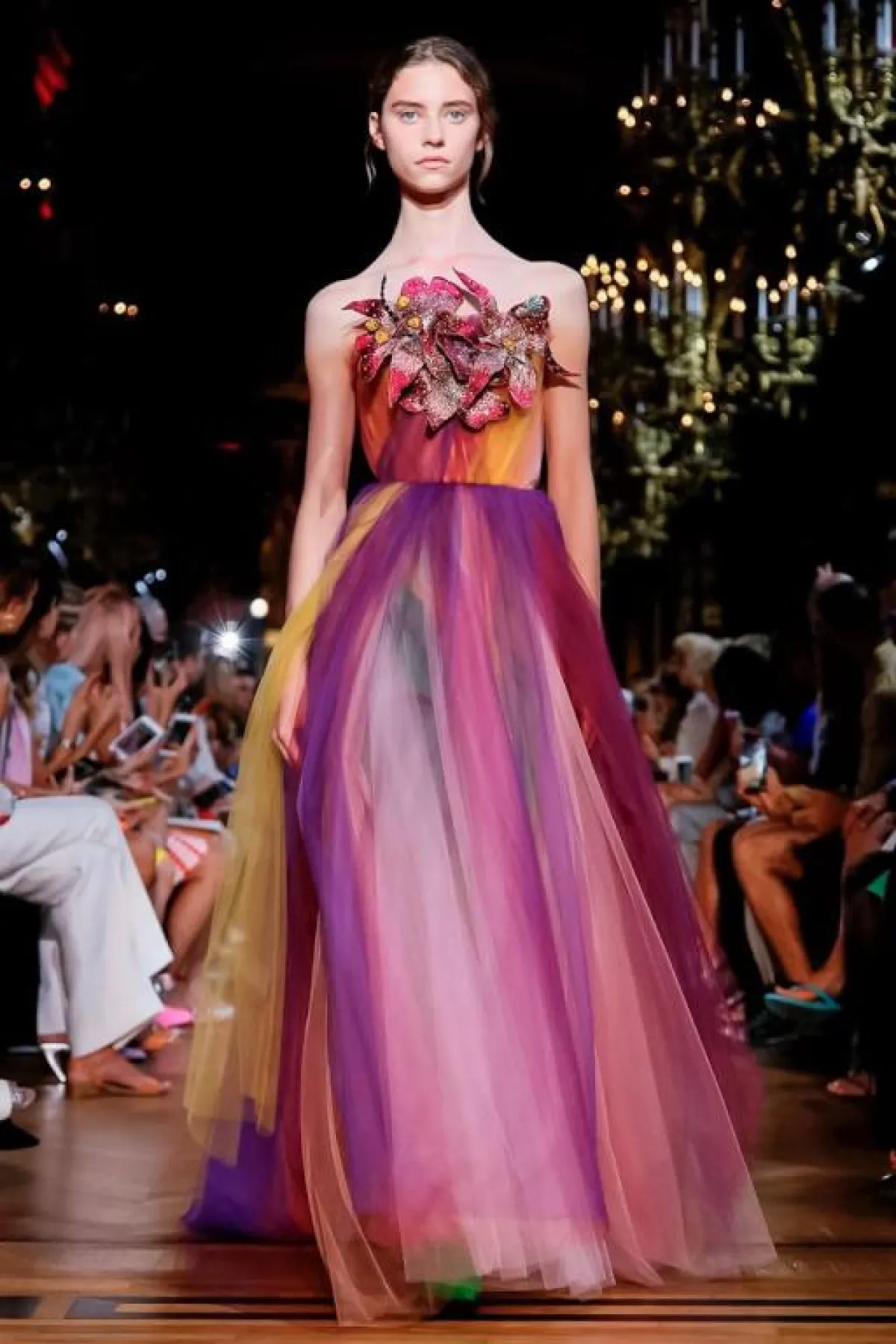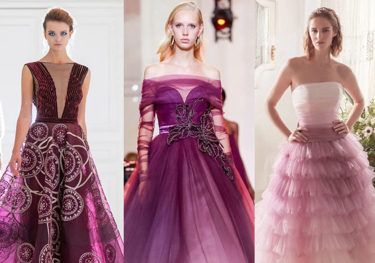 بعض الماركات قدمت فساتين خطوبة أرجواني مدموجة مع بعض الألوان الأخرى النابضة بالحيوية، مثل الفستان التول المزين بـ ورود الصدر من Schiaparelli، والفستان بكشاكش التول المنفوشة من Stephan Caras.