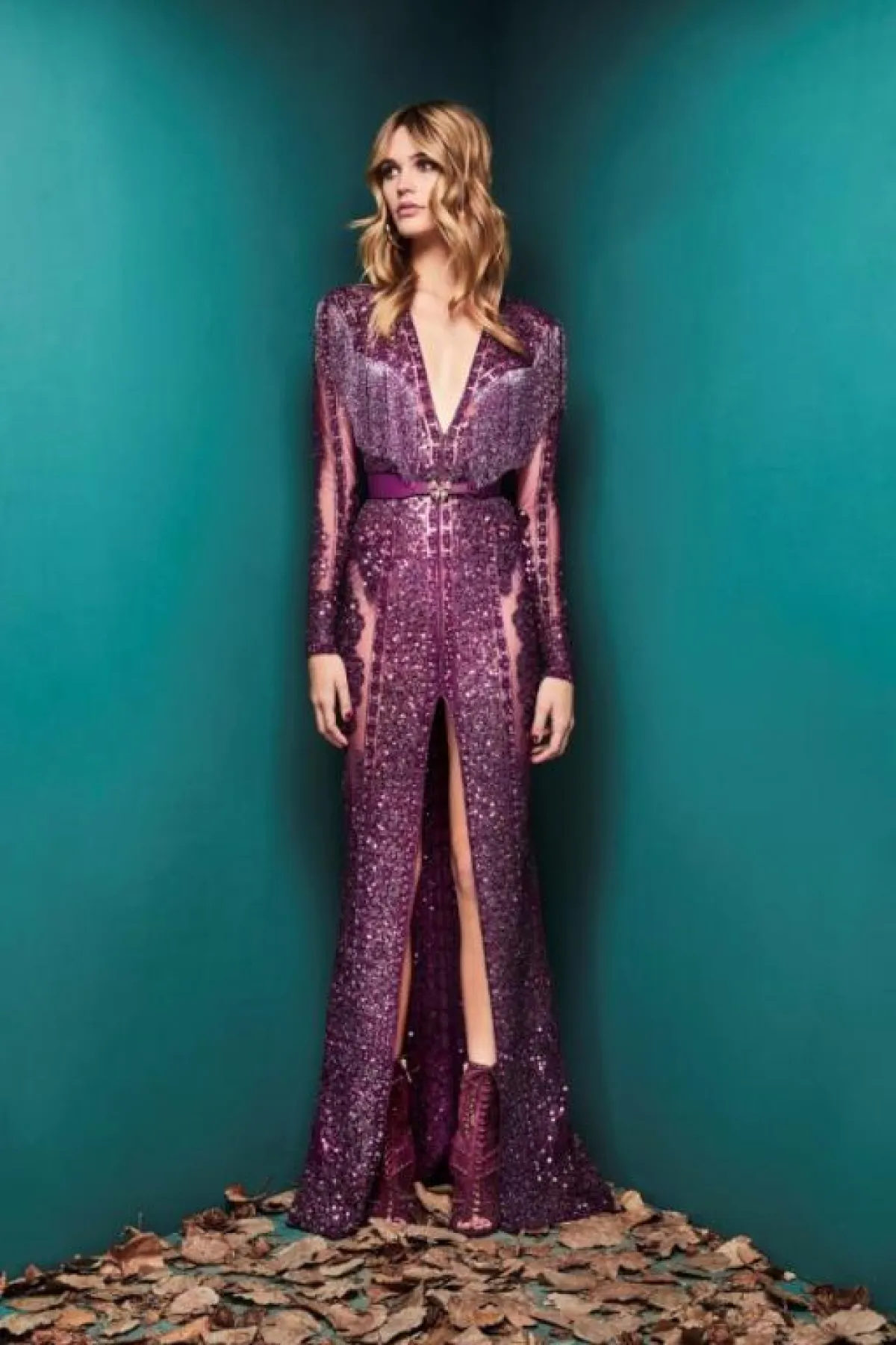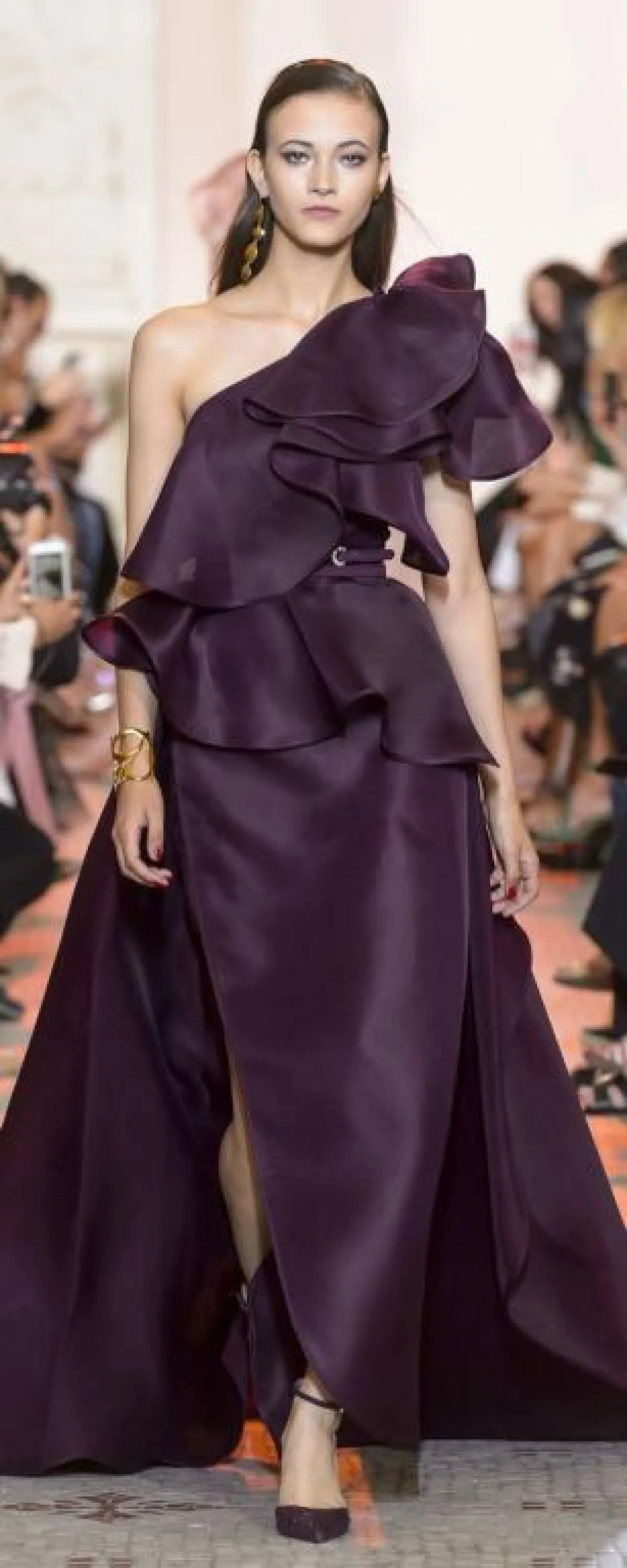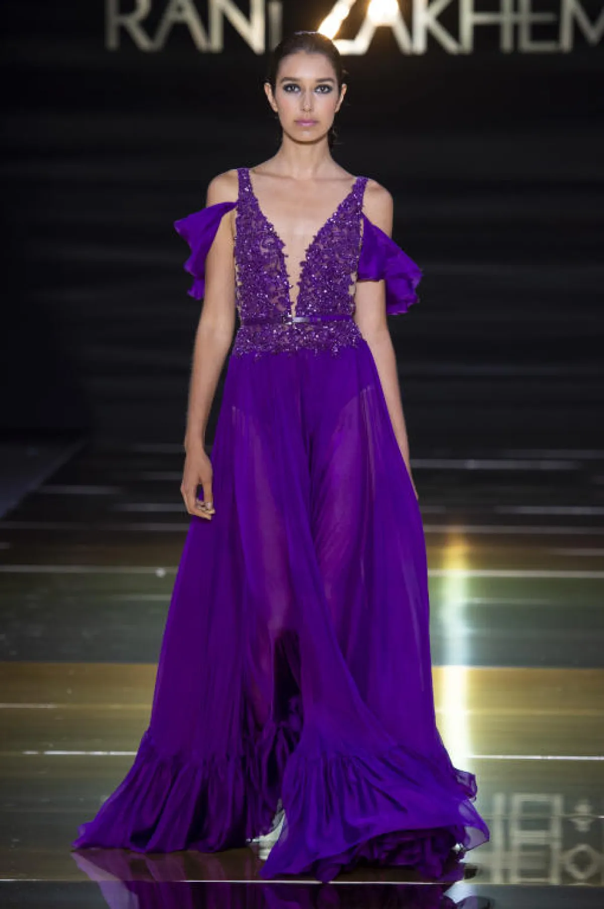 وبأسلوب عصري، قدم المصمم اللبناني راني زاخم Rani Zakhem فستان أرجواني بقماش شفاف مع قصّة Off Shoulder وتطريزات على الصدر.