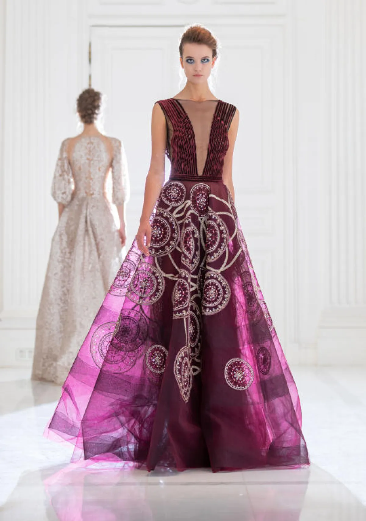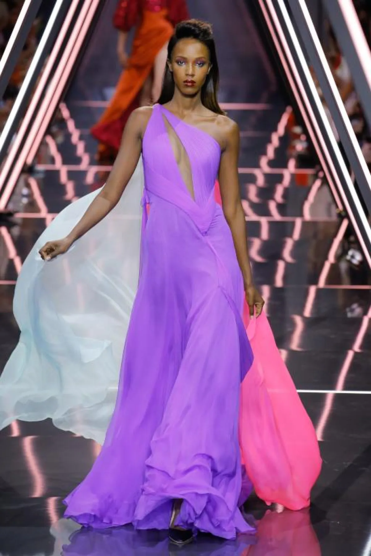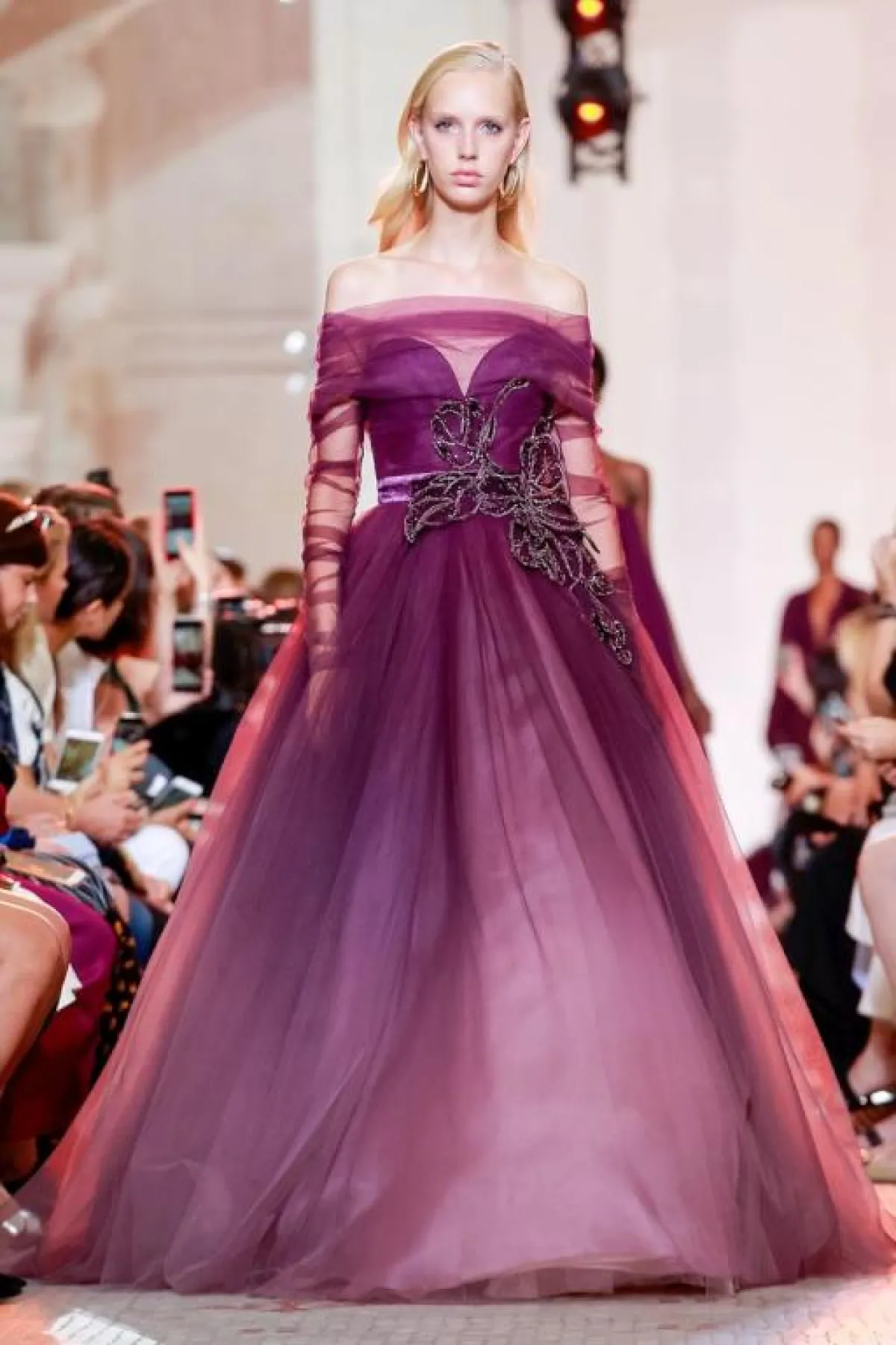 وبأسلوب عصري، قدم المصمم اللبناني راني زاخم Rani Zakhem فستان أرجواني بقماش شفاف مع قصّة Off Shoulder وتطريزات على الصدر.