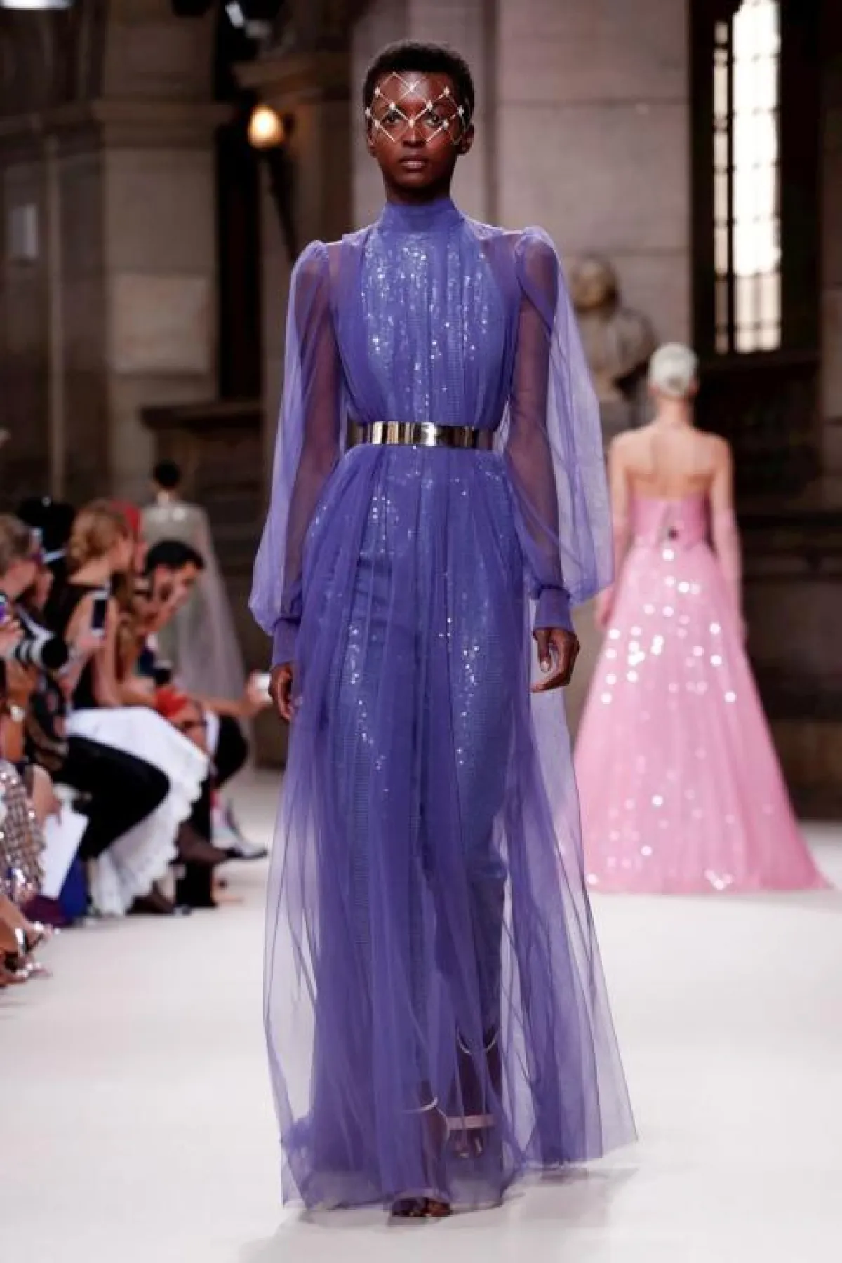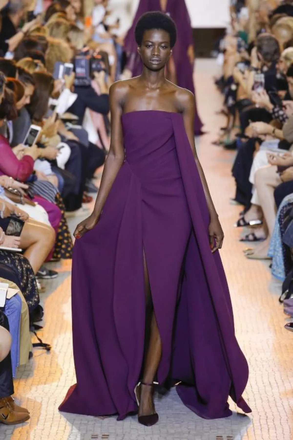 أيضاً قدم المصمم اللبناني جورج حبيقة Georges Hobeika فستان مخمل باللون الأرجواني بتصميم بسيط وفخم في نفس الوقت، بفضل التطريزات البرّاقة التي تزينه وصيحة الكاب مع الياقة المرتفعة.