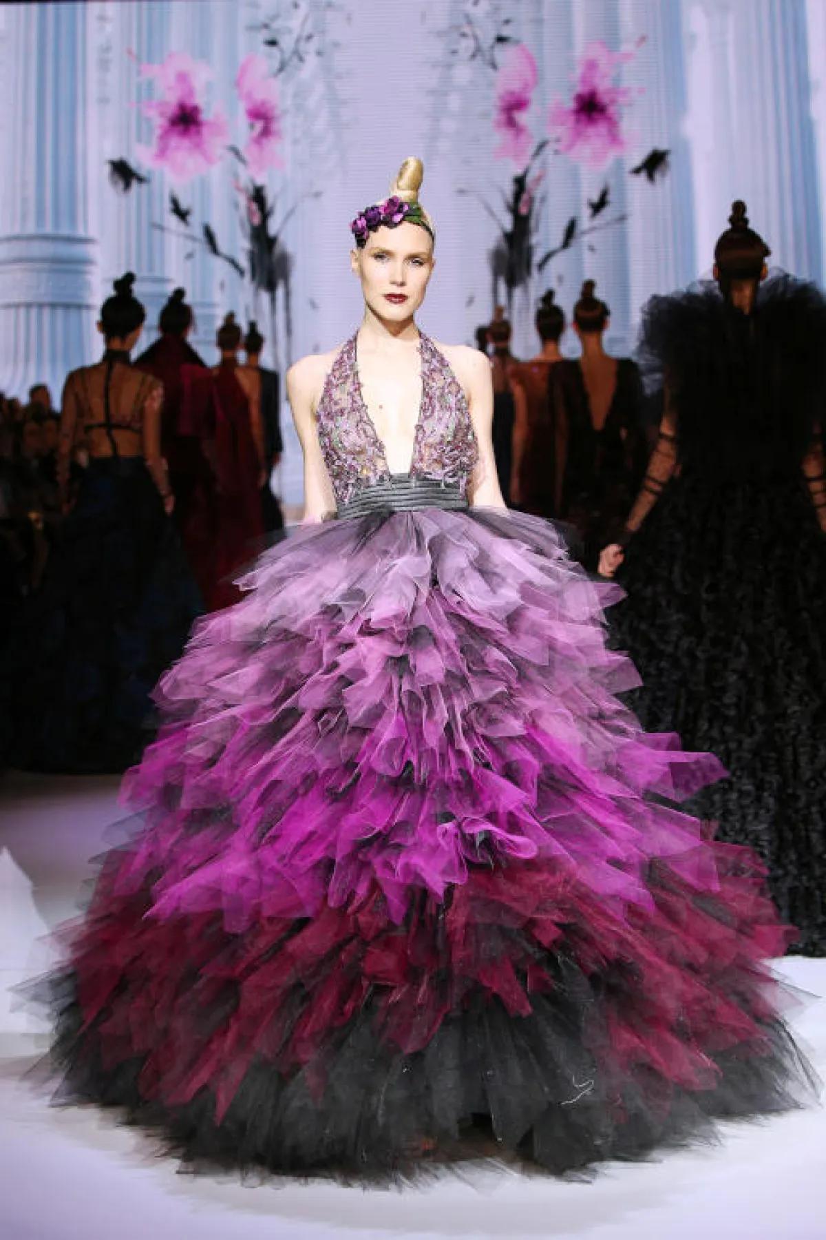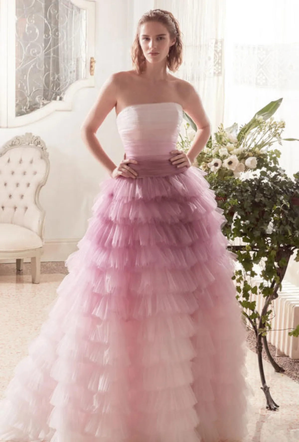 وبظلال الأرجواني الهادئة، قدمت ماركة بلومارين Blumarine فساتين أرجواني منفوشة بقماش التول، الفستان الأول بقصّة Strapless مع تنورة بطبقات متدرجة الأطوال، والثاني مزين بكشاكش الأكتاف والورود البارزة على الخصر.