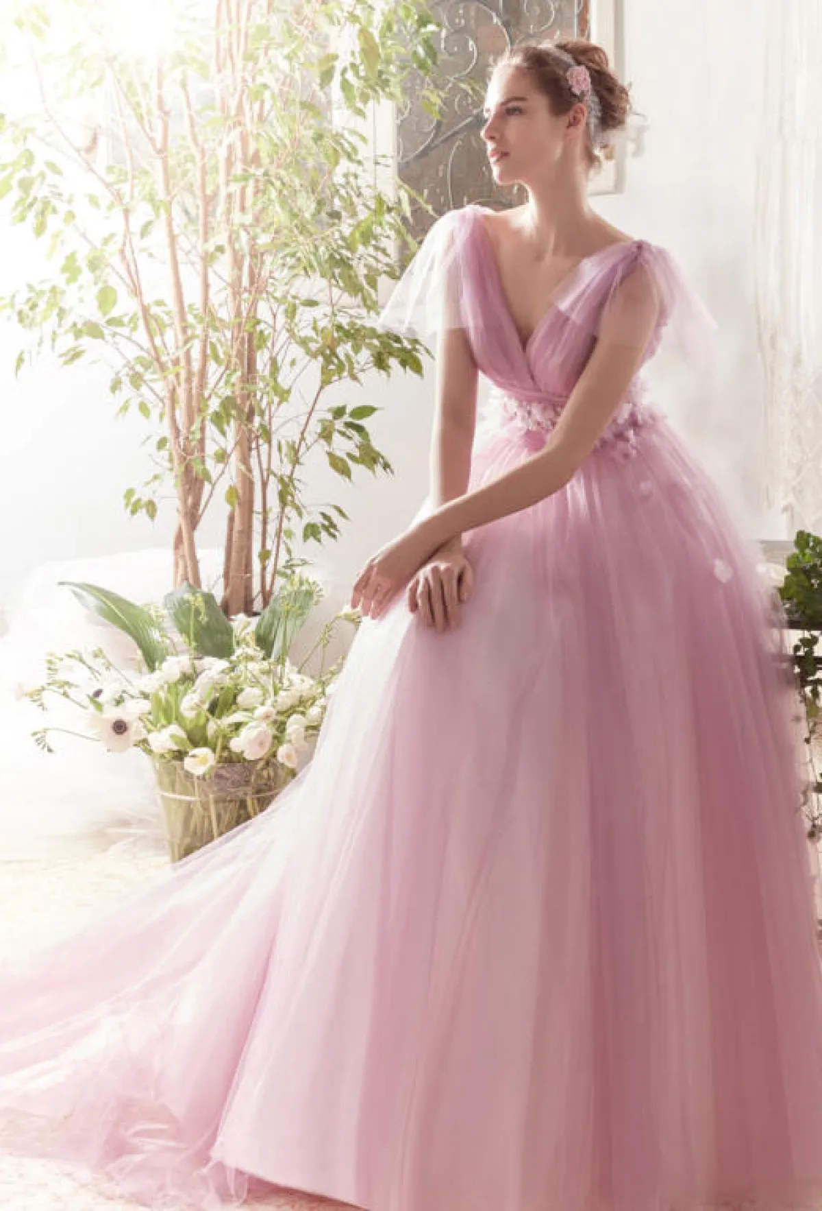 وقد برزت فساتين الخطوبة بتدرجات الأرجواني الفاتحة والليلكي لدى بعض الماركات، وهي الألوان التي تناسب العروس الرقيقة والناعمة، مثل فستان روزا كلارا Rosa Clara بالتصميم البسيط القصير من الأمام والطويل من الخلف مع فيونكة الصدر.