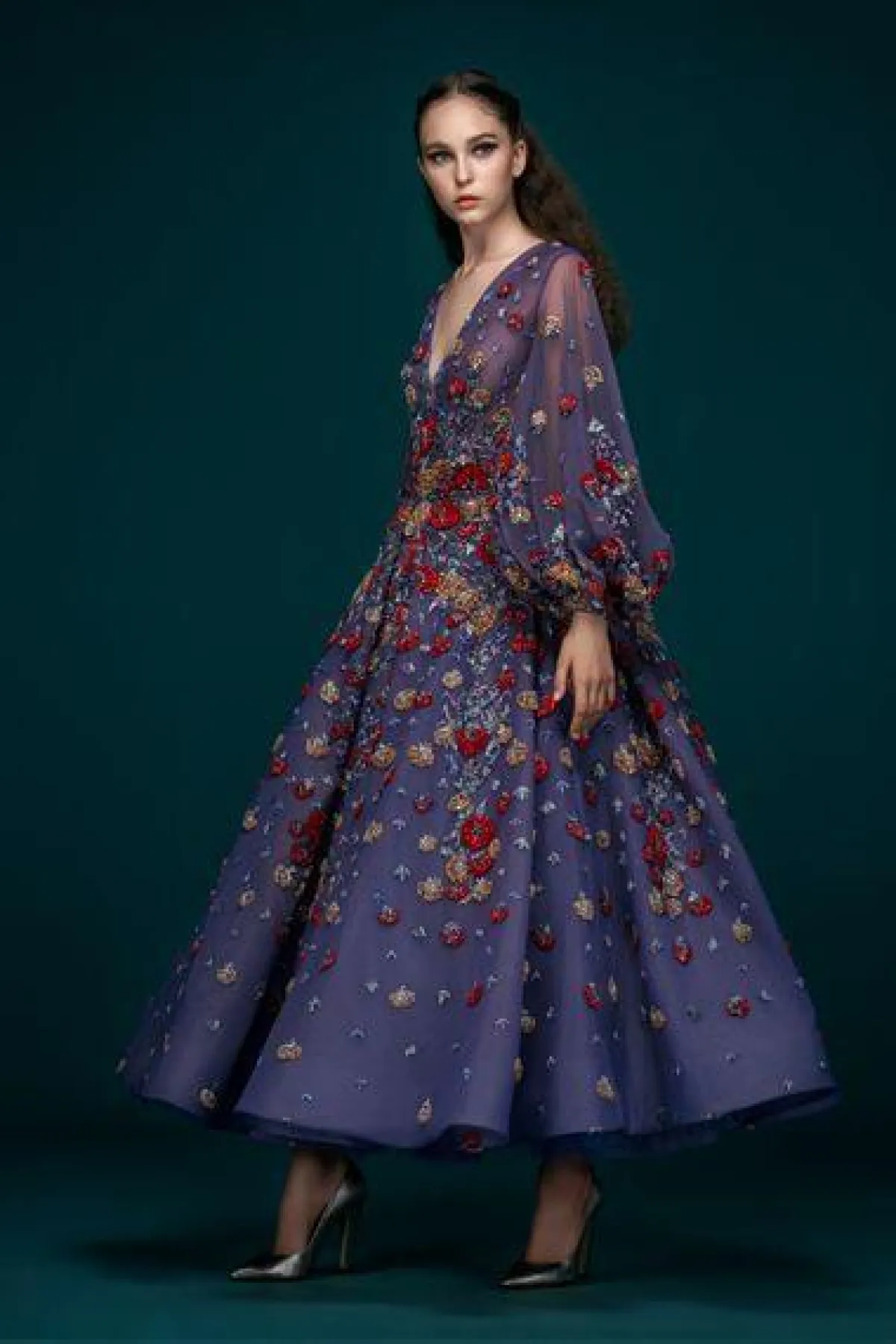 أحببنا أيضاً الفستان الأرجواني المنفوش والمزين بـ الورود الملونة مع أكمام طويلة شفافة من توقيع المصمم اللبناني سعيد قبيسي Saiid Kobeisy.