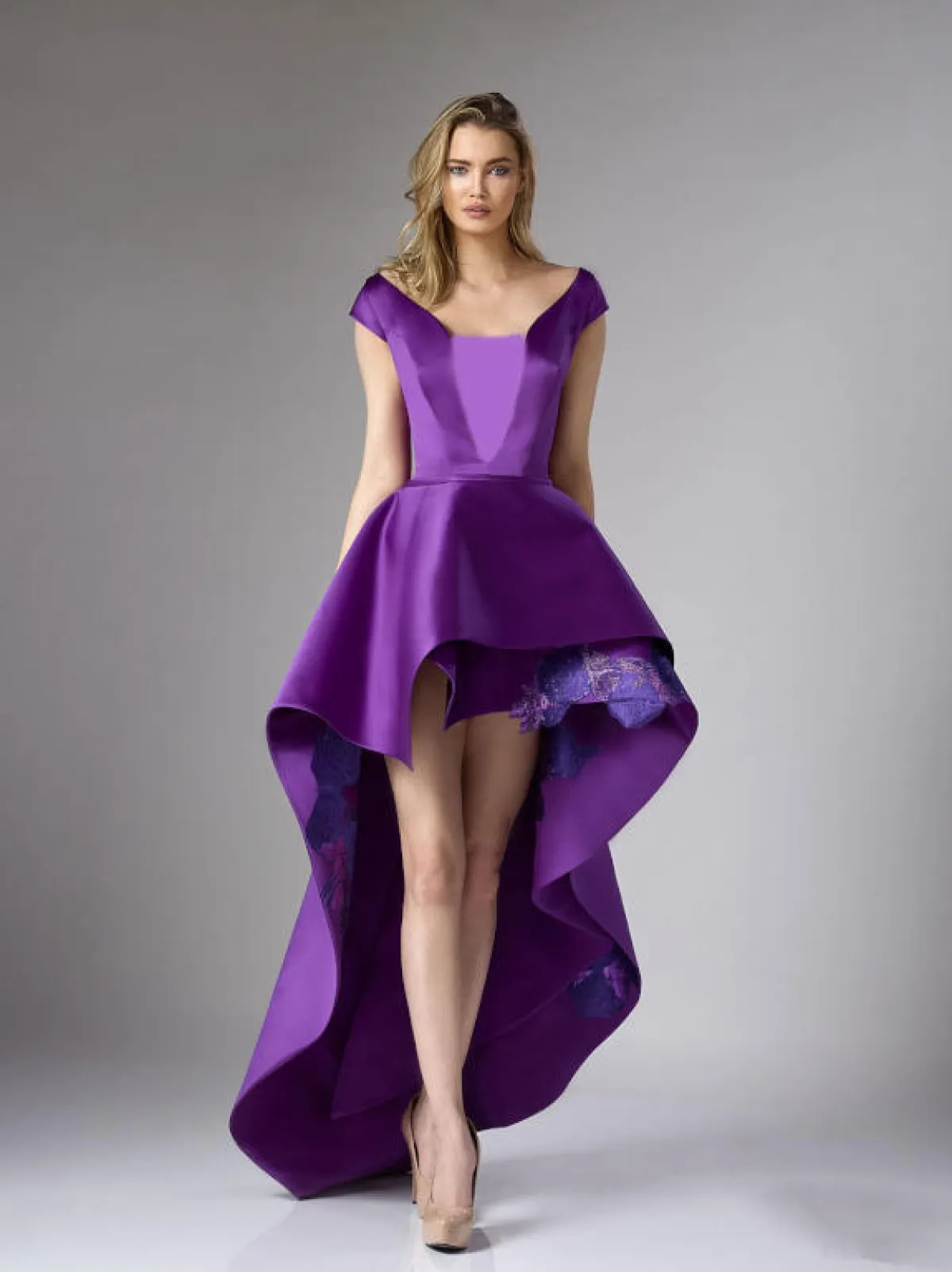 كذلك قدم المصمم Edward Arsouni فساتين أرجواني مفعمة بالأنوثة، مثل الفستان القصير من الأمام والطويل من الخلف بقماش الستان High Low Dress، والفستان الضيق بصيحة الـPeplum وتنورة حورية البحر Mermaid.