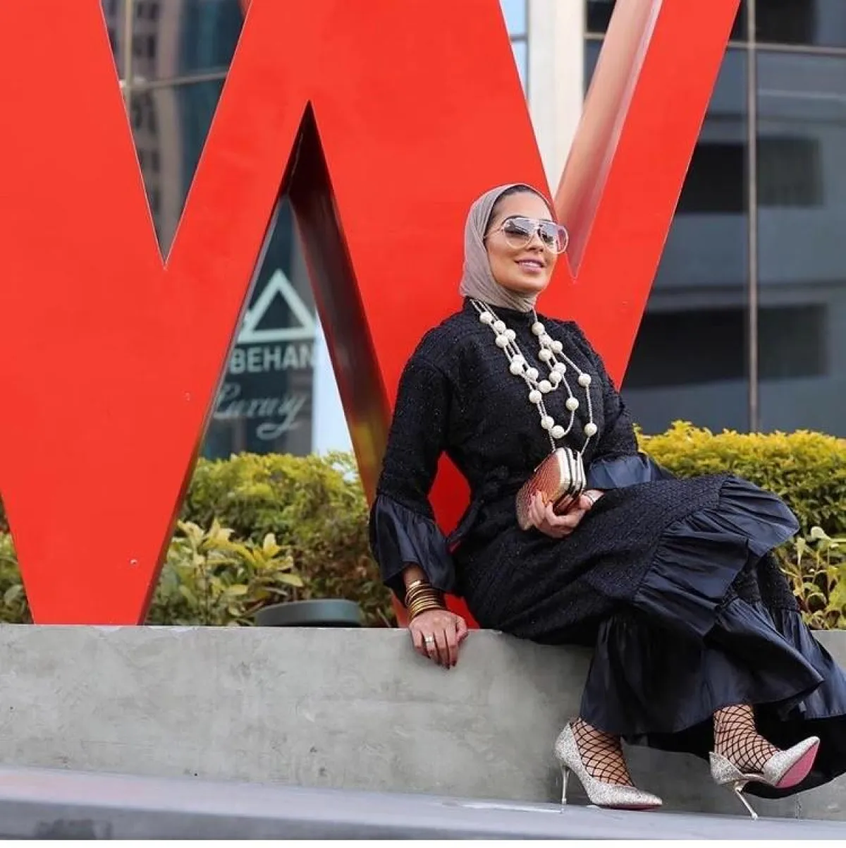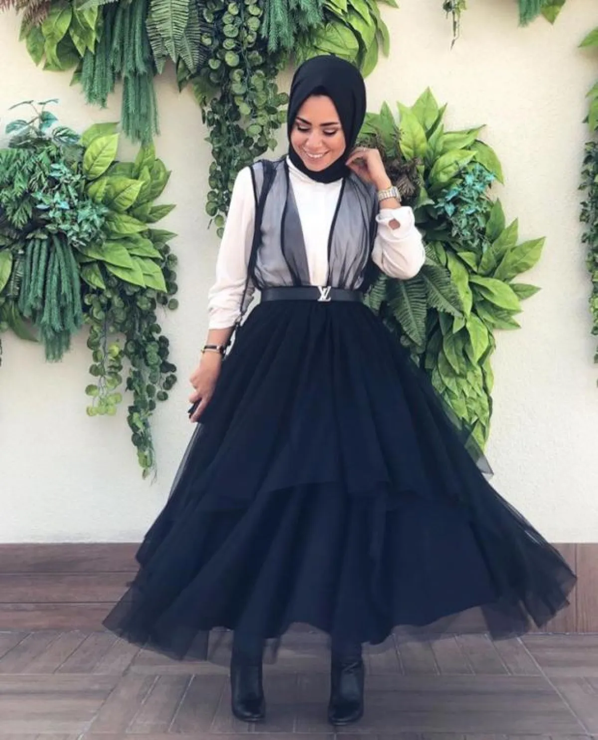 استطاعت المدونة التركية إيبرو سيفير أن ترتدي فستانًا مكشوفًا بطريقة محتشمة تناسب المحجبات، إذ اختارت توب أبيض مع الفستان الأسود الشيفون الشفاف، وانتقت البوت الأسود الطويل ليكمل الطلة، ووضعت حزامًا من لويس فيتون Louis Vuitton .