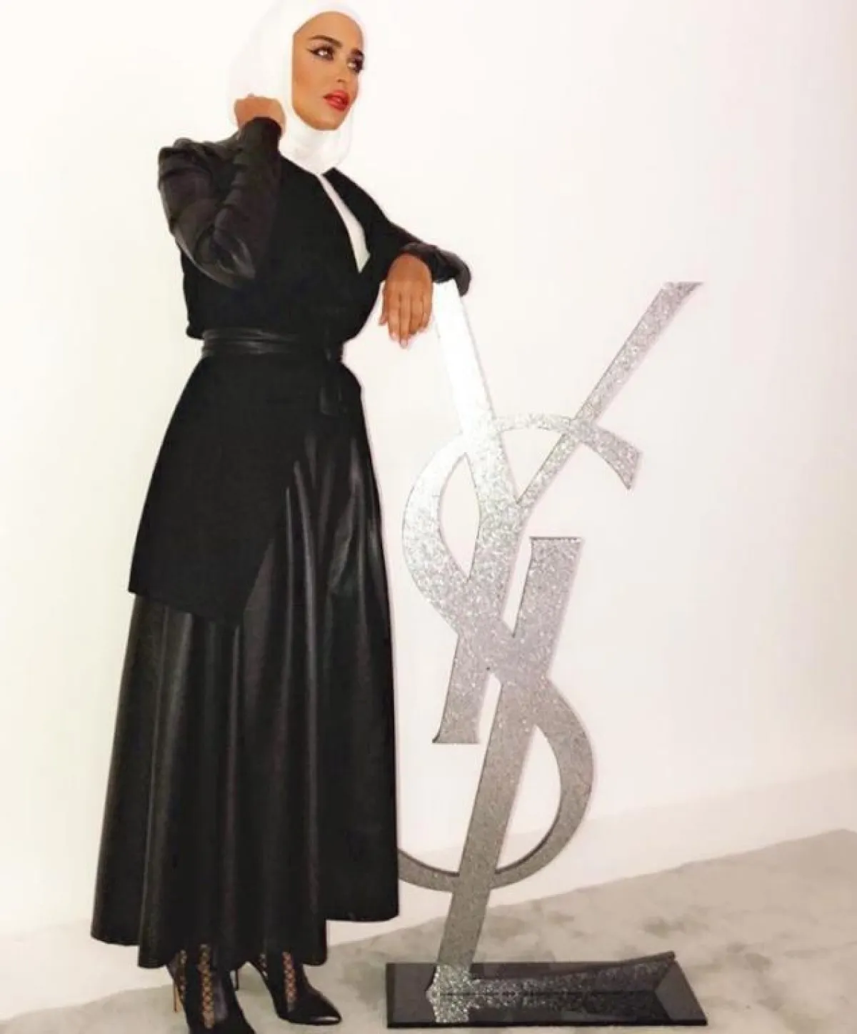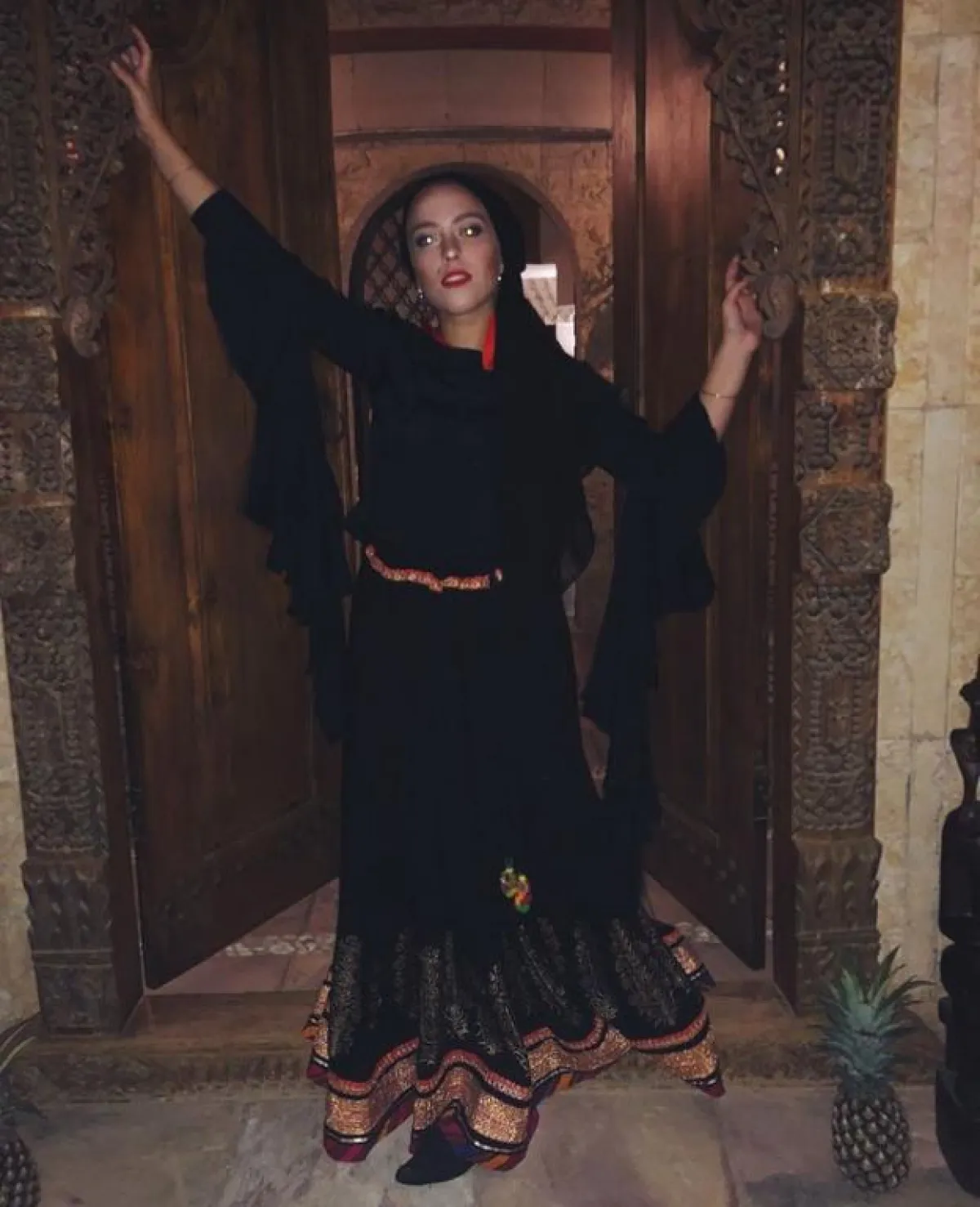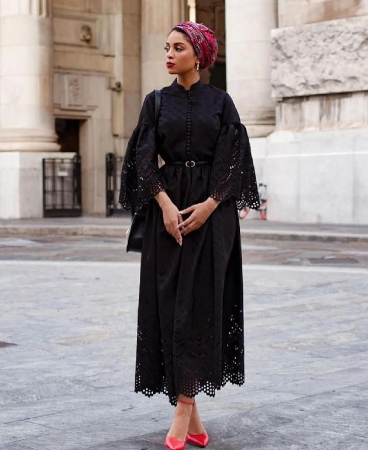 المدونة العالمية صوفيا جودسون ظهرت بالفستان الأسود الأنيق بخامة مرنة ومريحة يدخل بها القطن، جاء مزركشًا قليلًا، مع تطريزات الجوبير على الأطراف والأكمام، لإطلالة محتشمة وملكية، نسقت معه حذاء مدببًا باللون الأحمر، وشنطة سوداء اللون، وتوربان ملونة.