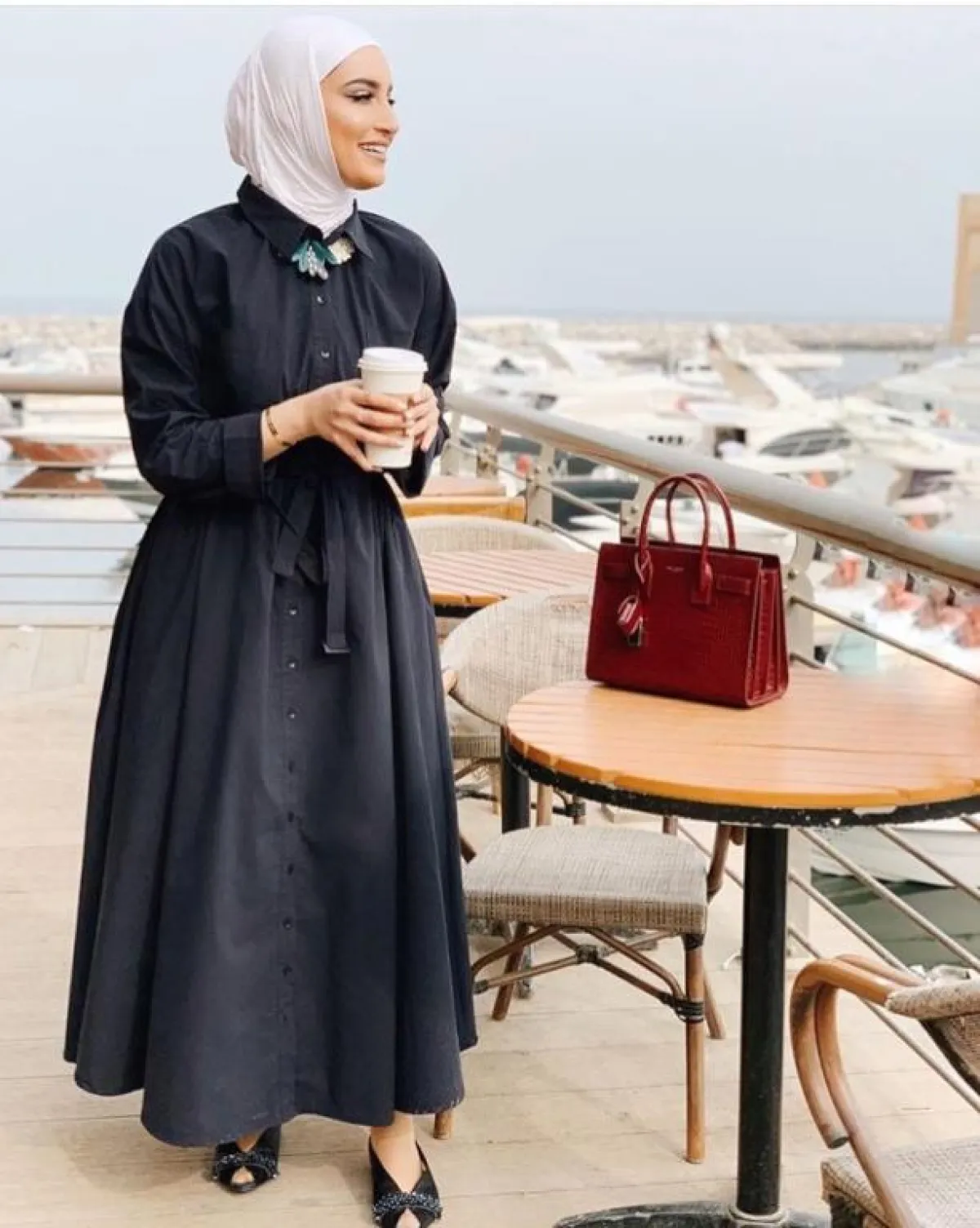 اعتمدت الفاشينيستا دلال الدوب على فستان أكثر بساطة بأزرار أمامية، مع حزام الخصر ليبرز رشاقتها، نسقت معه شنطة متوسطة الحجم باللون الأحمر الصريح، ولم تغيّر اللون الأبيض الاعتيادي لحجابها، تناسب هذه الإطلالة المشاوير النهارية السريعة أو أوقات العمل.