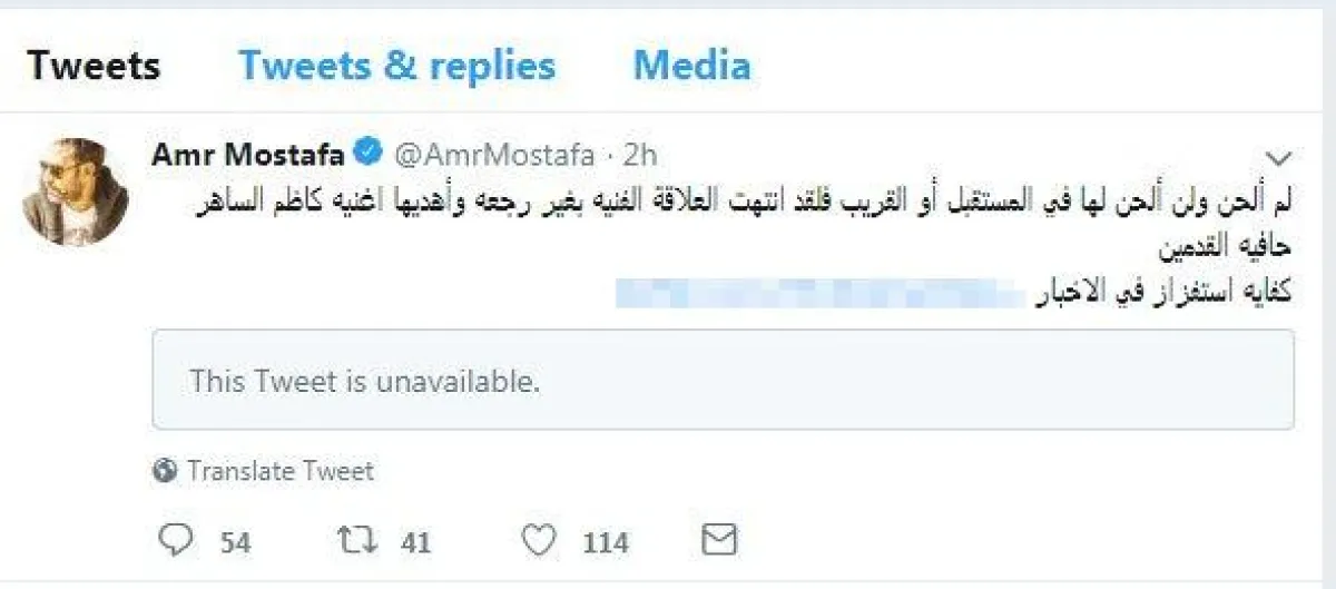 أضاف مغردا عبر موقع تويتر: لم ألحن ولن ألحن لها فى المستقبل أو القريب، فلقد انتهت العلاقة الفنية بغير رجعة، وأهديها أغنية كاظم الساهر حافية القدمين كفاية استفزاز فى الأخبار.