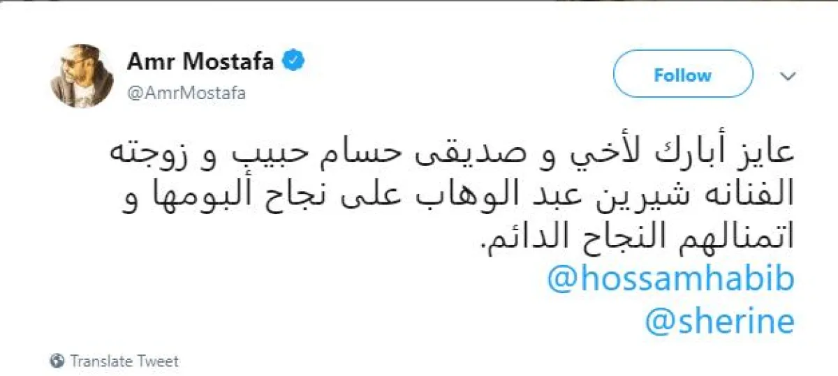 الملحن عمرو مصطفى حذف بالفعل تغريدة أكد فيها أنه لن يتعاون أبدا مع شيرين عبد الوهاب، وأهداها ساخرا أغنية "حافية القدمين" لكاظم الساهر تلميحا لواقعة مسيئة جمعته بشيرين، وكتب بدلا منها تغريدة تهنئة قال فيها: عايز أبارك لأخي و صديقى حسام حبيب و زوجته الفنانه شيرين عبد الوهاب على نجاح ألبومها و اتمنالهم النجاح الدائم، مع مشاركة التغريدة لحسام وشيرين. وتمنى الجمهور عبر التعليقات أن تستمر هذه المصالحة وألا يعود مصطفى لإهانة المطربة المصرية مجددا.