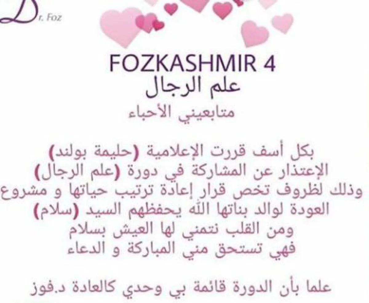 أعلنت الدكتورة فوزية دريع انسحاب الإعلامية حليمة بولند من دورة "علم الرجال" الخاص بتقديم استشارت خاصة بالرجال على سناب شات"، مشيرة إلى أن السبب يعود إلى قرار حليمة بالعودة الى والد ابنتيها وإعادة ترتيب حياتها من جديد، متمنية لها التوفيق، ومؤكدة أن الدورة مستمرة، وسوف تقوم عليها وحدها.