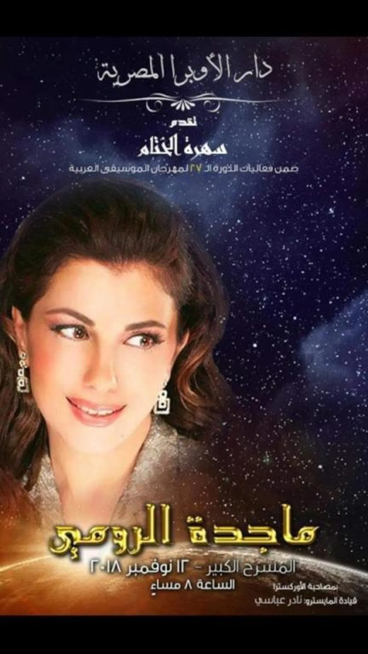الحفل المُقرر إقامته يوم 12 نوفمبر الجاري في القاعة الكبرى لدار الأوبرا المصرية هو الأوّل لماجدة الرومي بعد غياب 15 عاماً، وتم تخصيص أوركسترا القاهرة السيمفوني بكامل أعضائه بقيادة الموسيقار نادر عباسي للعزف.