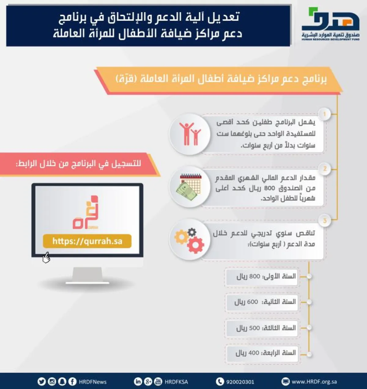 أتاح صندوق تنمية الموارد البشرية (هدف)، للمرأة السعودية العاملة الاستفادة من برنامج دعم حضانة الأطفال (قرة) إلكترونيا من خلال زيارة الموقع الالكتروني على الرابط: www.qurrah.sa.