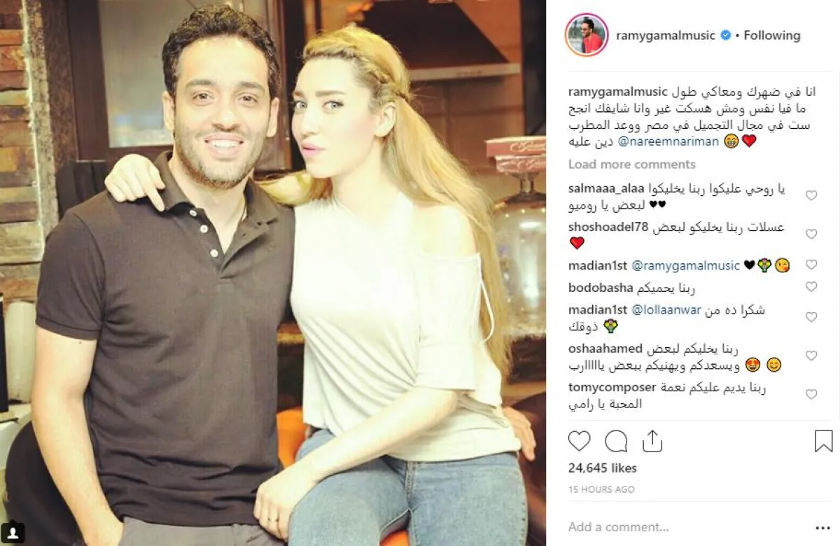 رامى جمال أعلن دعمه لزوجته ناريمان عقب افتتاح أول مركز تجميل يحمل اسمها، وقال عبر منشور خاص بحسابه بموقع انستقرام: "أنا في ظهرِك ومعاكي طول ما فيا نفَس، ومش هسكت غير وأنا شايفك أنجح ست فى مجال التجميل فى مصر، ووعد المطرب دين عليه".