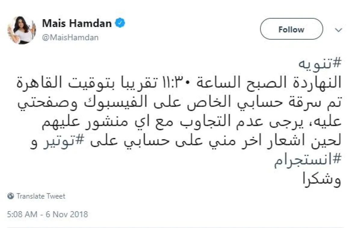 ميس حمدان كشفت رسميًّا عن سرقة حسابها بموقع الفيسبوك، عبر رسالة تحذير أطلقتها من حسابيها بموقعي تويتر وانستقرام، قالت فيها: تنويه..النهاردة الصبح الساعة 11:30 تقريبًا بتوقيت القاهرة.. تم سرقة حسابي الخاص على الفيسبوك وصفحتي عليه، يرجى عدم التجاوب مع أي منشور عليهم لحين إشعار آخر مني على حسابي على تويتر وانستغرام.. وشكرًا.