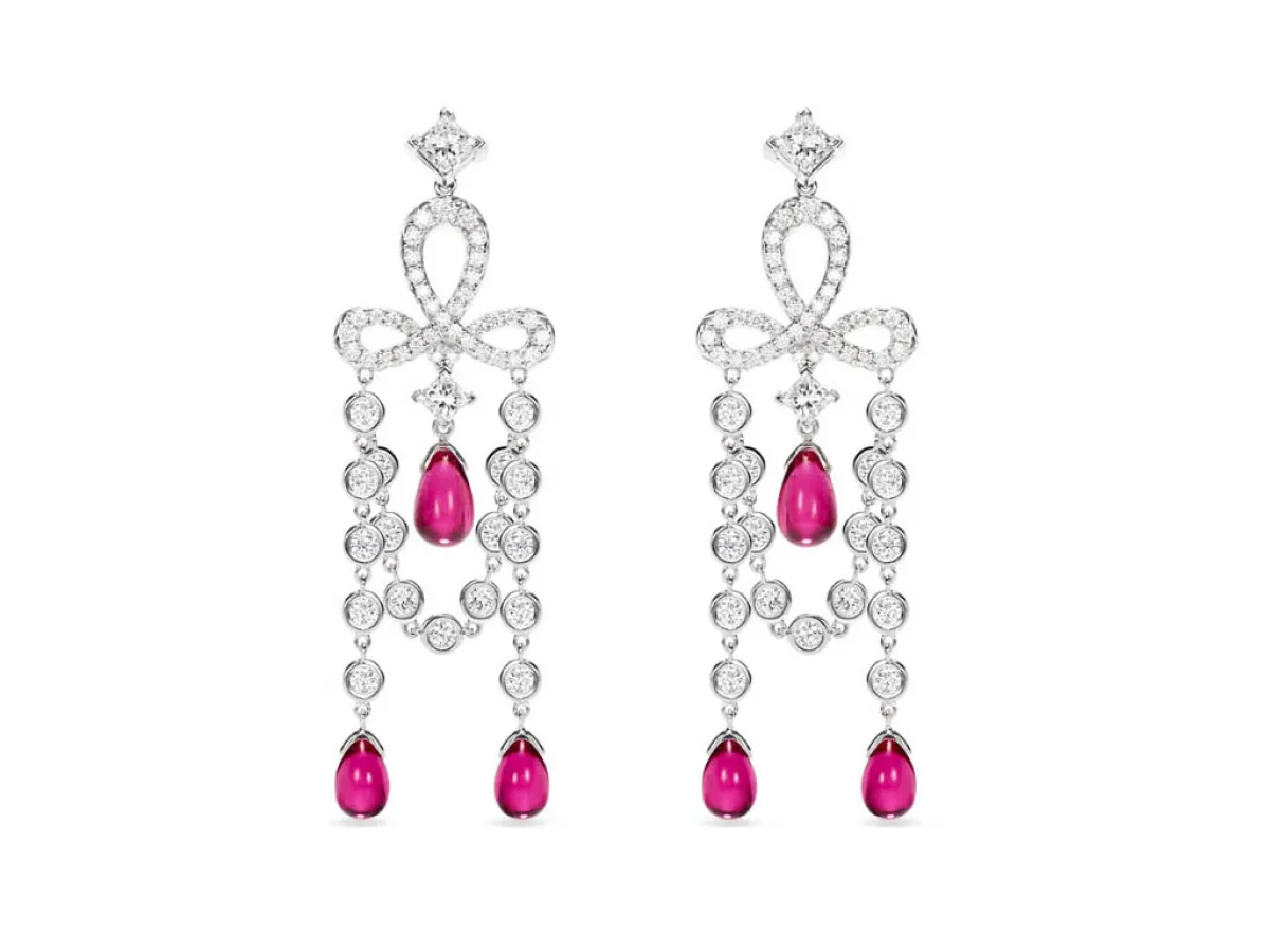أقراط من مجموعة "لايملايت كوتور بريسيوز" Limelight Couture Precieuse من "بياجيه" Piaget. تتميز هذه الأقراط، المصنوعة من الذهب الأبيض، بتصميمها الجذاب والفخم، حيث تتدلى منها أحجار الروبيليت الزهرية وتضيئها حبات الماس الأبيض المتلألئة. وهي تصلح لمناسباتك الليلية التي تتطلب منك إطلالة أنيقة ولافتة.