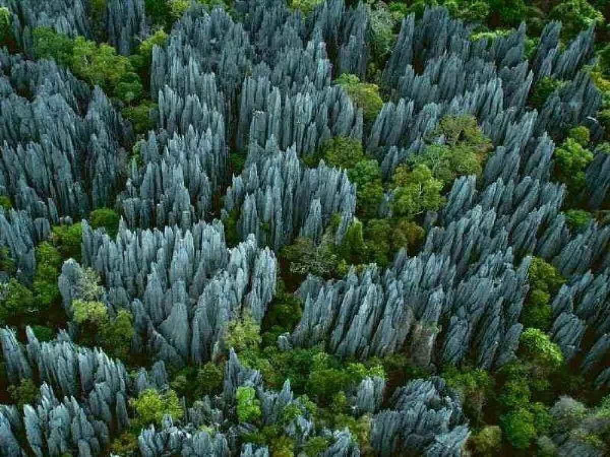 البداية، ستكون في "غابات الصخور" التي تقع غرب جزيرة مدغشقر"، والتي يجعلنا اسمها نتخيل هيئتها وطبيعتها، إلا أنه مهما حاولنا تخيل ذلك، لن نصل إلى روعة هذا المكان، الذي تملأه الصخور العملاقة المدببة الرأس، والتي تغطي المساحات الخضراء، وكأنه مشهد من أحد الكواكب الغريبة في الفضاء الخارجي، وليست في كوكب الأرض، حيث تشكلت هذه الصخور المدببة الهائلة، بسبب مياه الأمطار الموسمية الغزيرة جداً في تلك المنطقة، ويطلق عليها اسم "غراند تيسنغي" Grand Tsingy، والتي تعني بلغة السُكان المحليين "المكان الذي يصعب المشي فيه"، ولكن على الرغم من خطورتها ووعورتها الكبيرة، إلا أنها موطن للعديد من الحيوانات النادرة والتي من بينها 11 نوعاً من حيوان الـ"هوبر" النادر، والكثير من فصائل القرود.