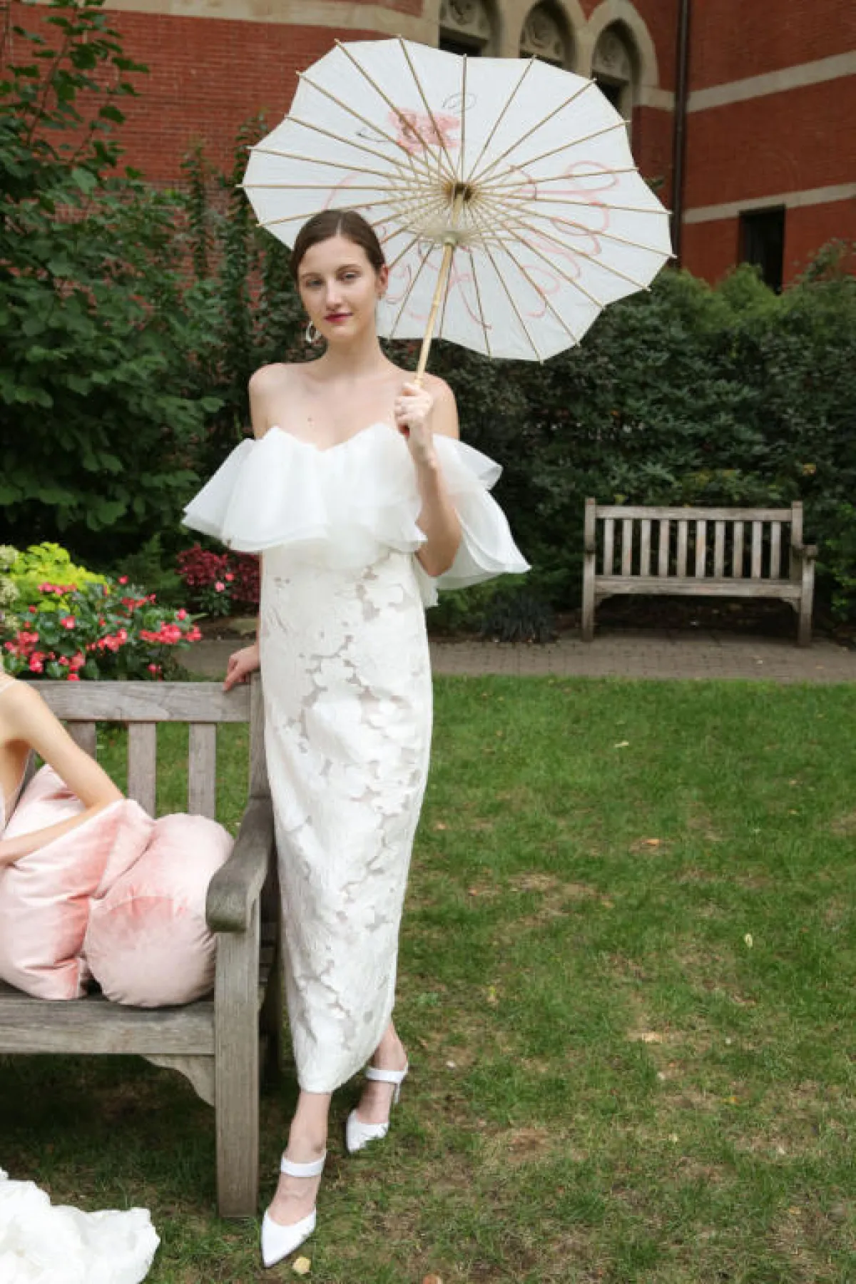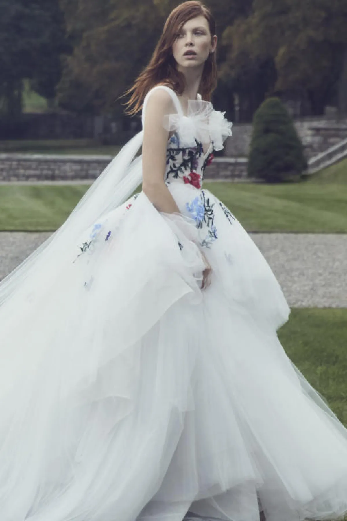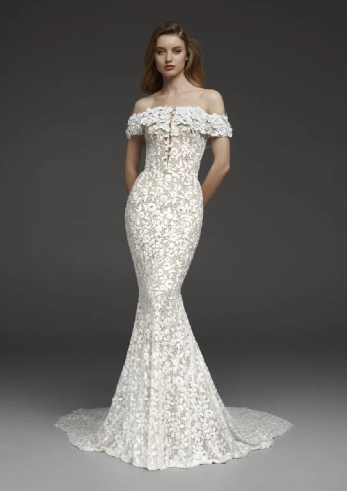 كما أن الفساتين المزينة بتطريزات الصدر أو الورود البارزة تمنحه حجم أكبر، مثل فساتين آن بيرغ Anne Barge، Gracy Accad، ماركيزا Marchesa، برونوفياس Pronovias، وتاداشي شوجي Tadashi Shoji.