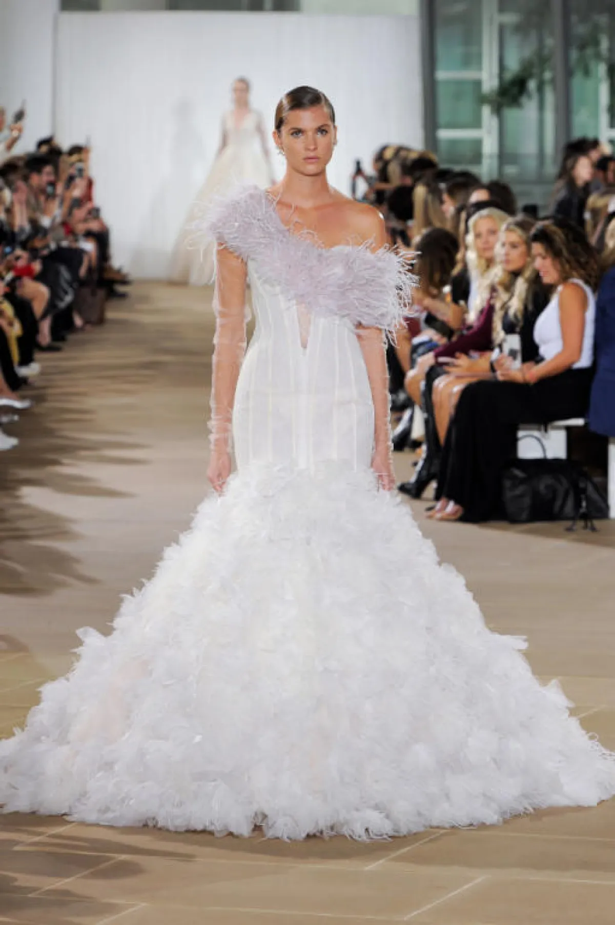 ويمكن أن يكون مزيناً بالريش على الصدر مثل فستان زفاف انيس دي سانتو Ines di Santo، أو بالكشاكش مثل فستان زفاف مونيك لولييه Monique Lhuillier.