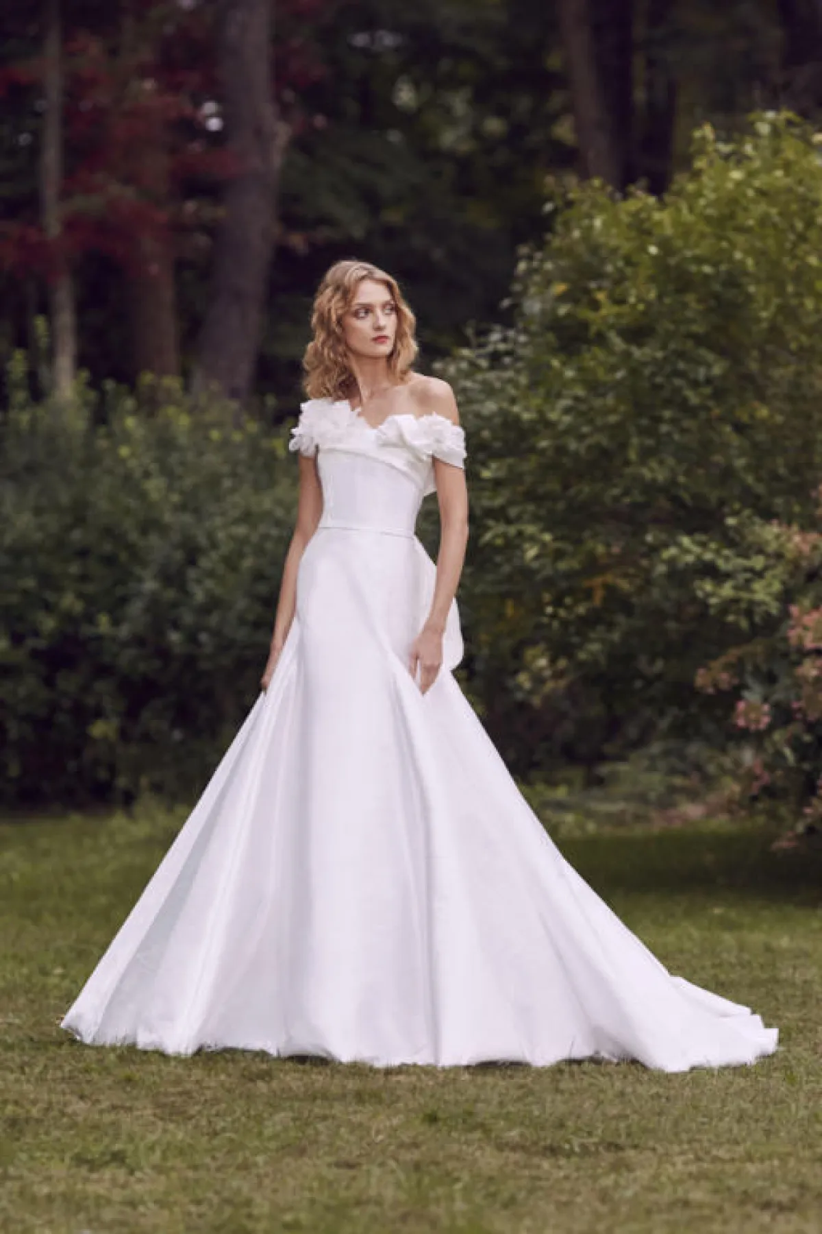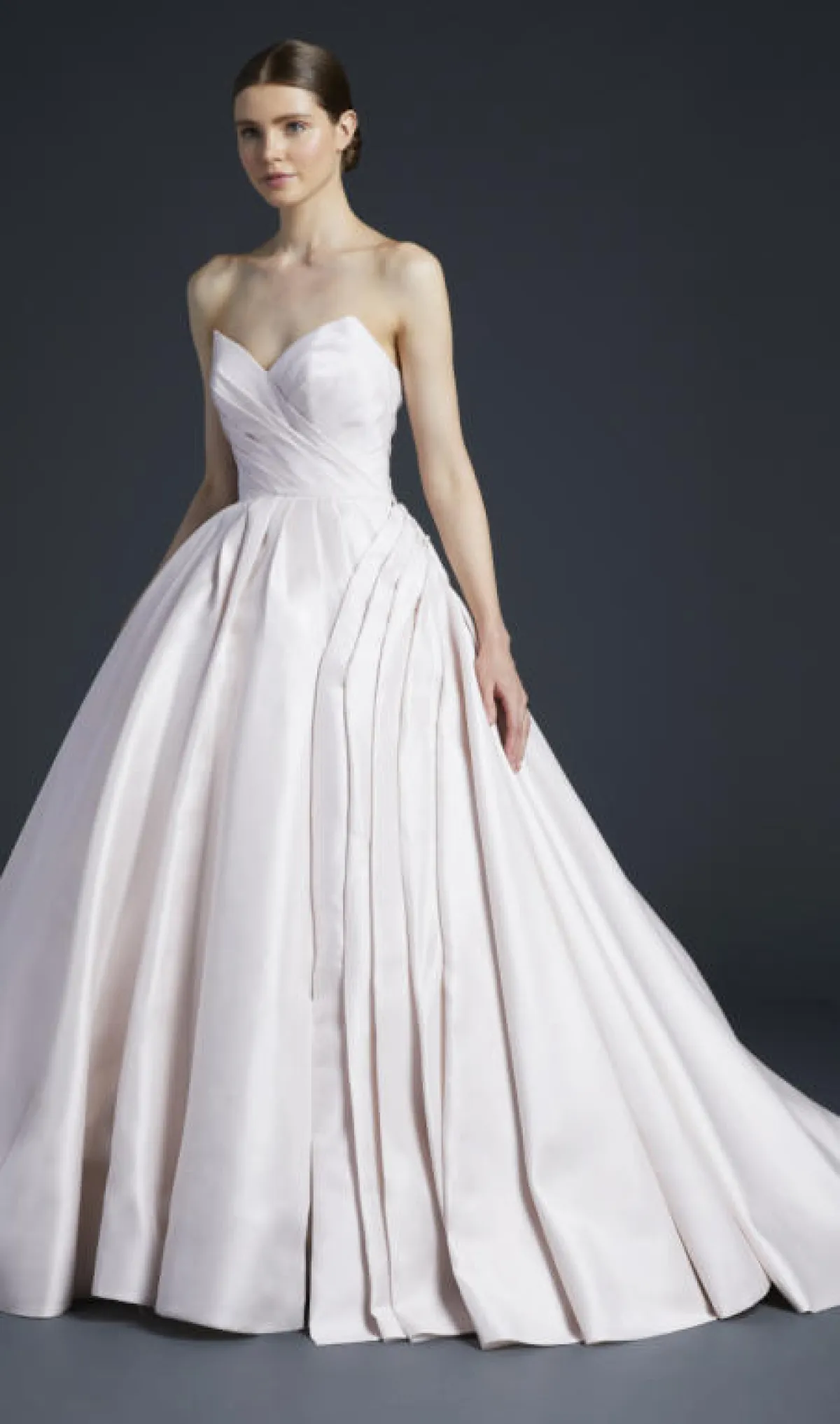 قدمت دار Amsale فستان زفاف مزود بفيونكة كبيرة على الصدر، مما يساعد في تغطية المنطقة وإخفاء حجمها الصغير، ولذلك يعتبر مثالياً لمن تملك صدراً صغيراً.