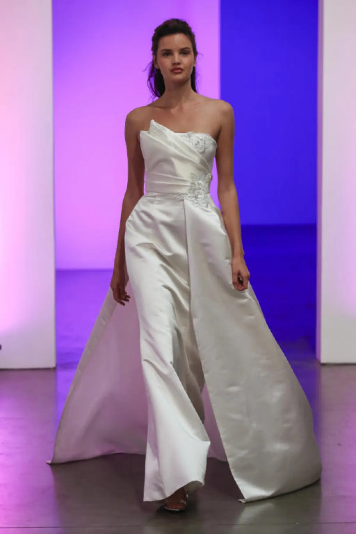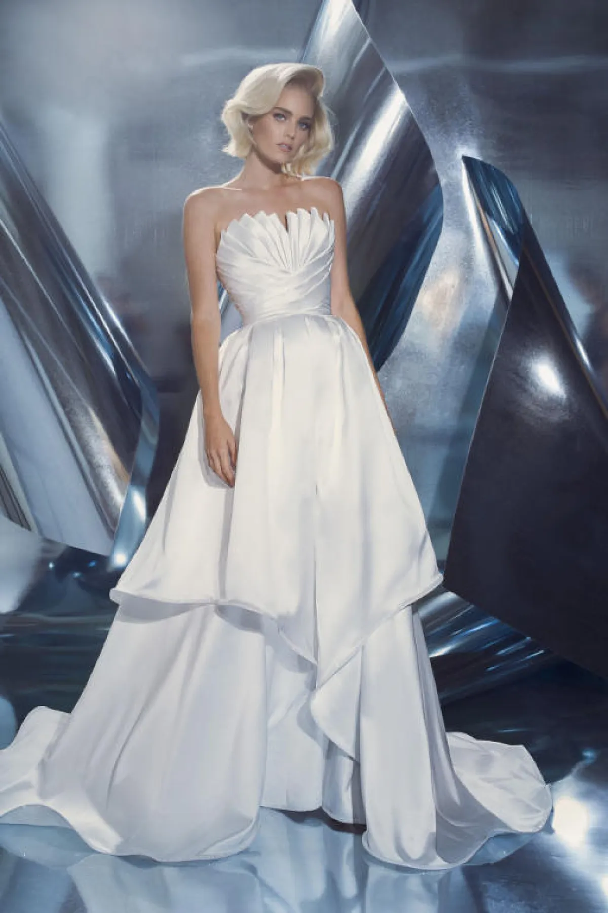 ويمكن أن يكون الفستان مزوداً بثنيات وطيّات بقماش الستان على الصدر، ليبدو أكبر حجماً، مثل فساتين آن بيرغ Anne Barge، Dany Mizrachi، رومونا كيفيزا Romona Keveza، وGracy Accad.