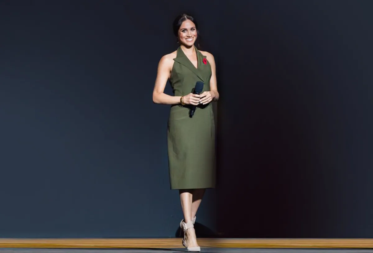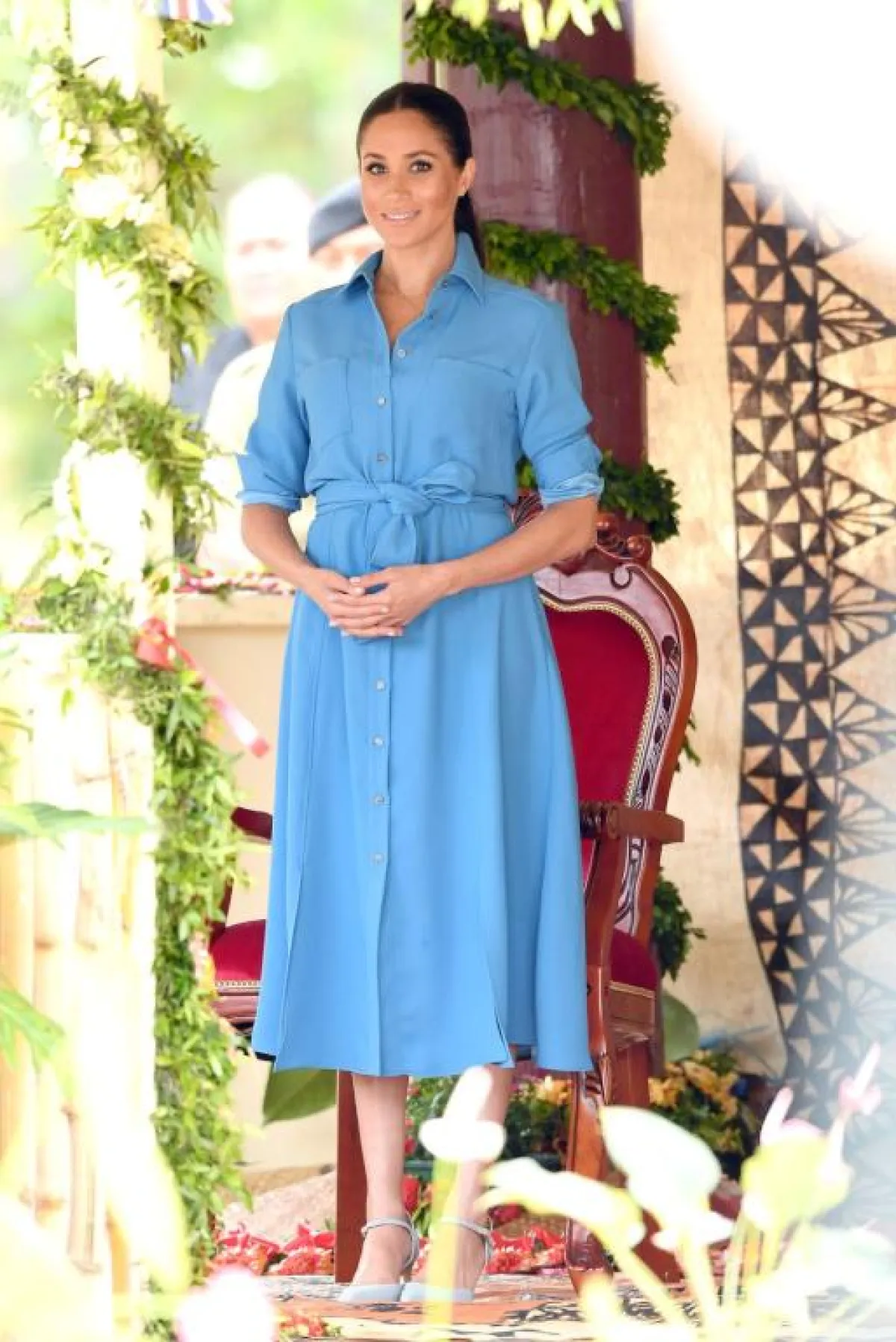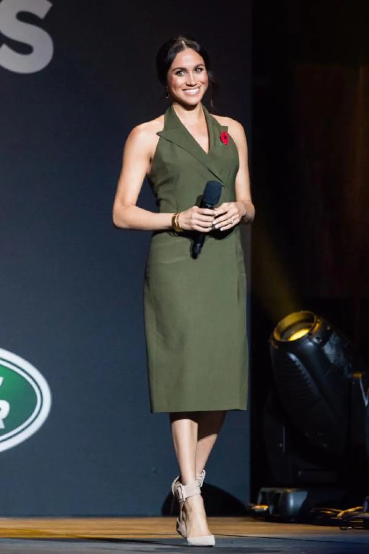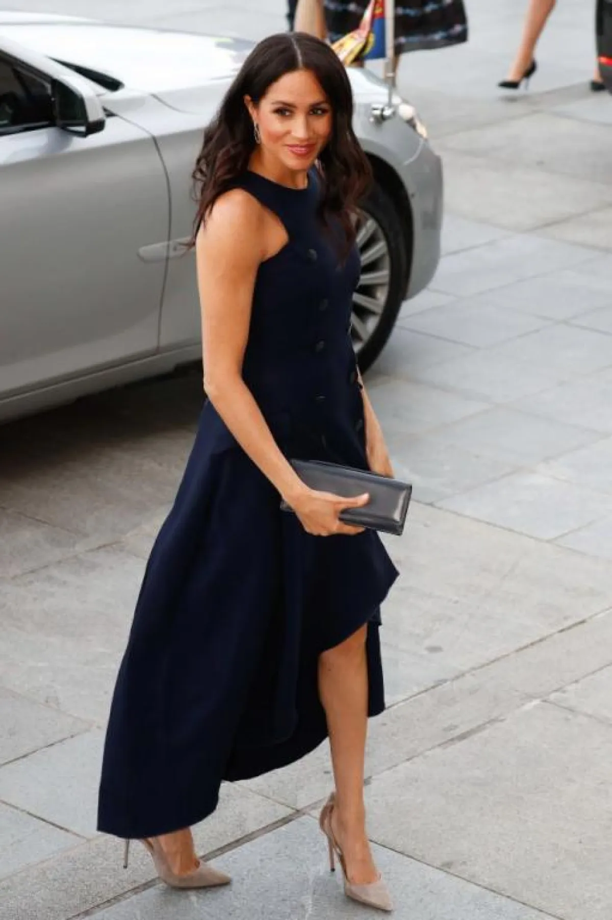 اعتمدت ميغان ميركل فستاناً بتصميم البليزر بدون أكمام، يمتد طوله إلى فوق الركبة، ورغم أن هذا الطول يكسر القواعد الملكية، إلا أن الساقين والذراعين المكشوفة ساعدت على جذب الانتباه بعيداً عن بروز البطن.