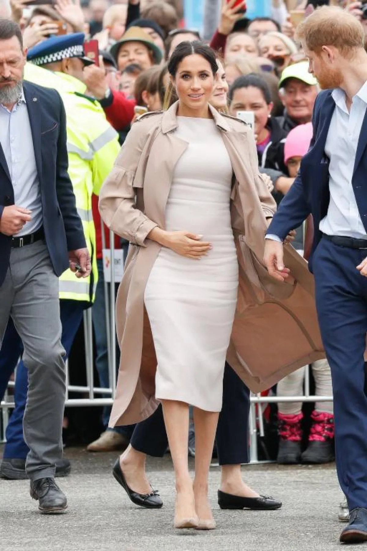 لم تقتصر إطلالات ميغان ميركل على الاحتفالات واللقاءات الرسمية، بينما تعتمد أيضاً أسلوباً عصرياً يناسب الإطلالات النهارية. خلال زيارتها إلى أستراليا، أطلت بـ جاكيت شتوي بصيحة الـ bomber jacket لتخفي بطنها تماماً، كما اعتمت معطف الترينش Trench الفضفاض باللون البيج، ونسقته مع فستان باللون نفسه يكشف عن حملها، إلا أن تفاصيل تصميم المعطف حد من هذا البروز، وساعدها في أن تبدو أنيقة وسعيدة بحملها أيضاً.