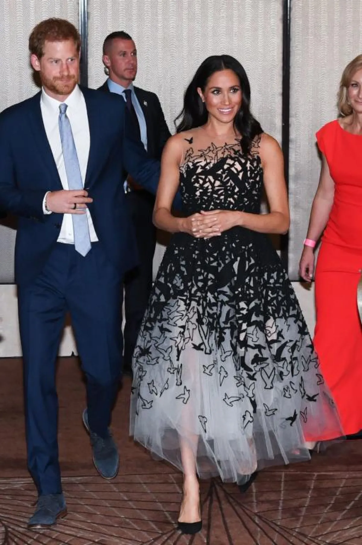 في أحدث ظهور لدوقة ساسكس بدت وكأنها أميرة من أميرات ديزني، حيث اعتمدت فستاناً بصيحة Fairytale ، بتوقيع دار أوسكار دي لا رنتا Oscar de la Renta، ونجح التصميم في إخفاء بروز البطن المحدود الذي أصبح واضحاً في أغلب إطلالات ميغان ميركل، ليس هذا فحسب، بينما نجحت الإطلالة في تحقيق معادلة الأناقة الملكية.