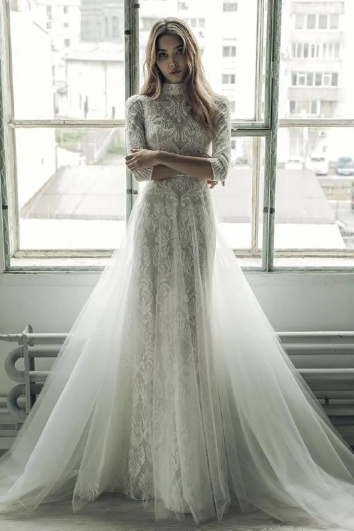 الدانتيل من الخامات الأساسية بـ فساتين الزفاف باللمسة الإيطالية التي تناسب الملامح المخملية والرقيقة للصبايا، كالتصميم المطرز بالكامل، مع العنق المقفول، والمشغول بالدانتيل الناعم، مع تصميم الـ Open Front.