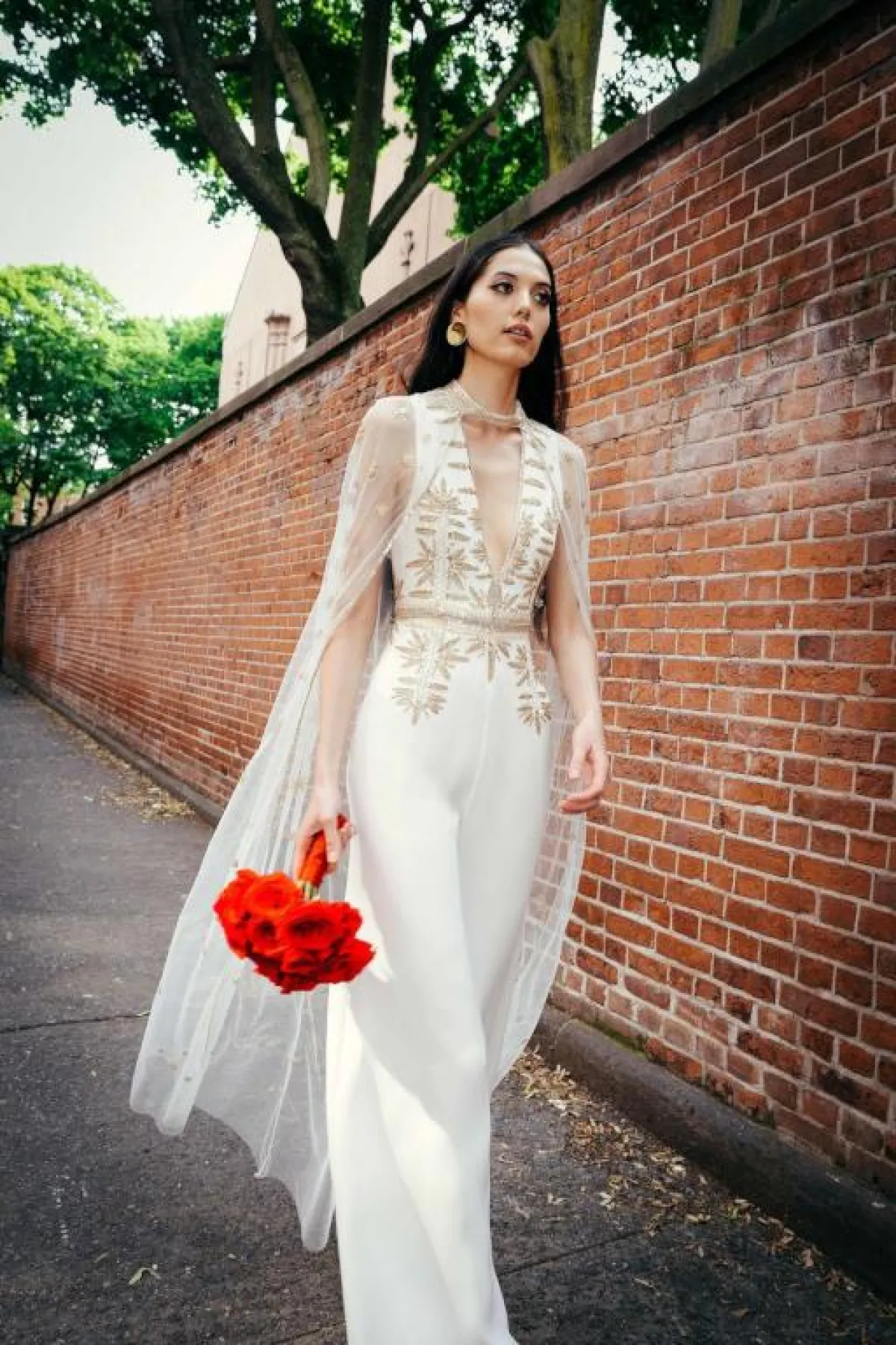 الجمبسوت خيار الصبيّة التي تبحث عن الاختلاف دومًا، اعتمديه مع تطريزات ذهبية، وبنطلون شارلستون واسع يضيف لكِ طولًا ونحافة، ومن الممكن أن يكون هذا التصميم هو خياركِ الثاني، إن كنتِ ممّن يفضلنَ ارتداء أكثر من فستان بـ حفل الزفاف.