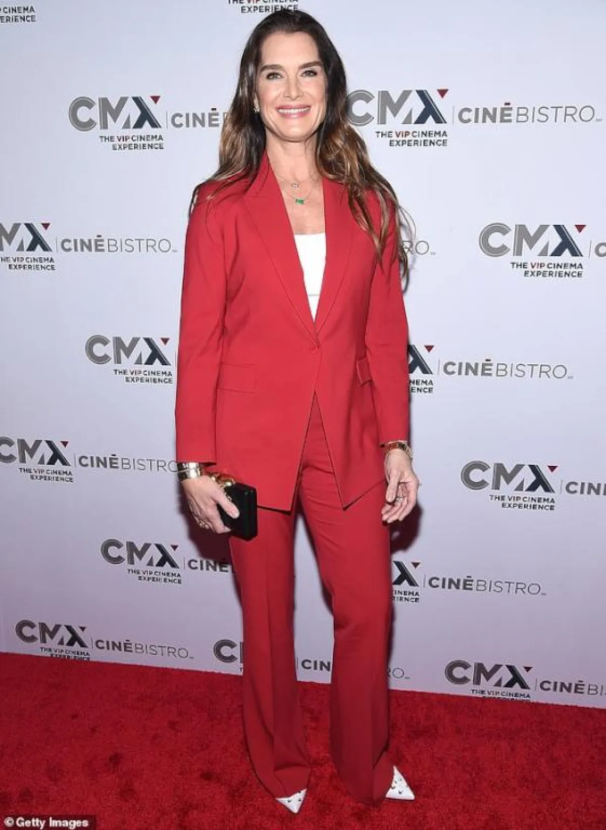 وتألقت الممثلة البالغة من العمر 53 عامًا باطلالة ذكورية، هي عبارة عن بدلة باللون الأحمر .