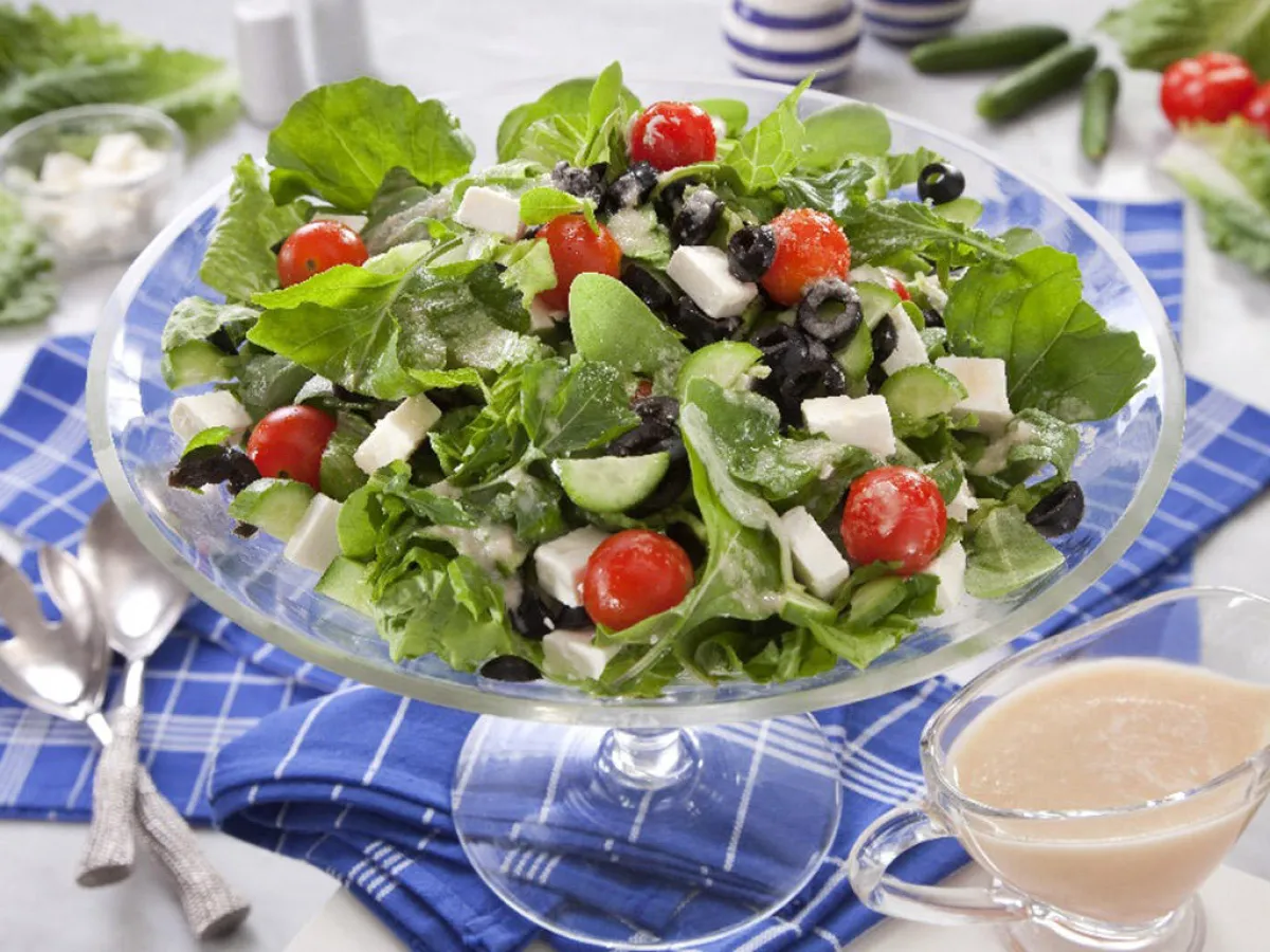4- وزّعي الزيتون والجبن. قدّمي السلطة مباشرة مع بقيّة الصلصة لمن يريد.