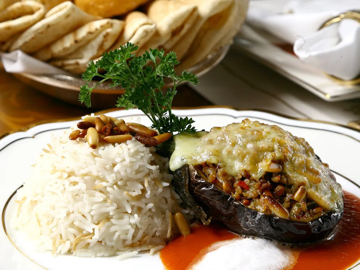 2-تضرب الطماطم في الخلاط، وتوضع في طنجرة، مع رشّة من الملح ورشّة من البهار. يُضاف إليها كوب من الماء، وتترك حتى تغلي، ثمّ تُرفع من على النار وتصفّى. نضع اللحم المفروم فوق أنصاف الباذنجان، وتُسكب صلصة الطماطم، ثمّ تُرشّ فوقها جبنة موزاريللا، ونُدخلها إلى الفرن لمدّة خمس دقائق على درجة حرارة تبلغ 190 درجة. يقدّم معها الأرز بالشعيريّة.