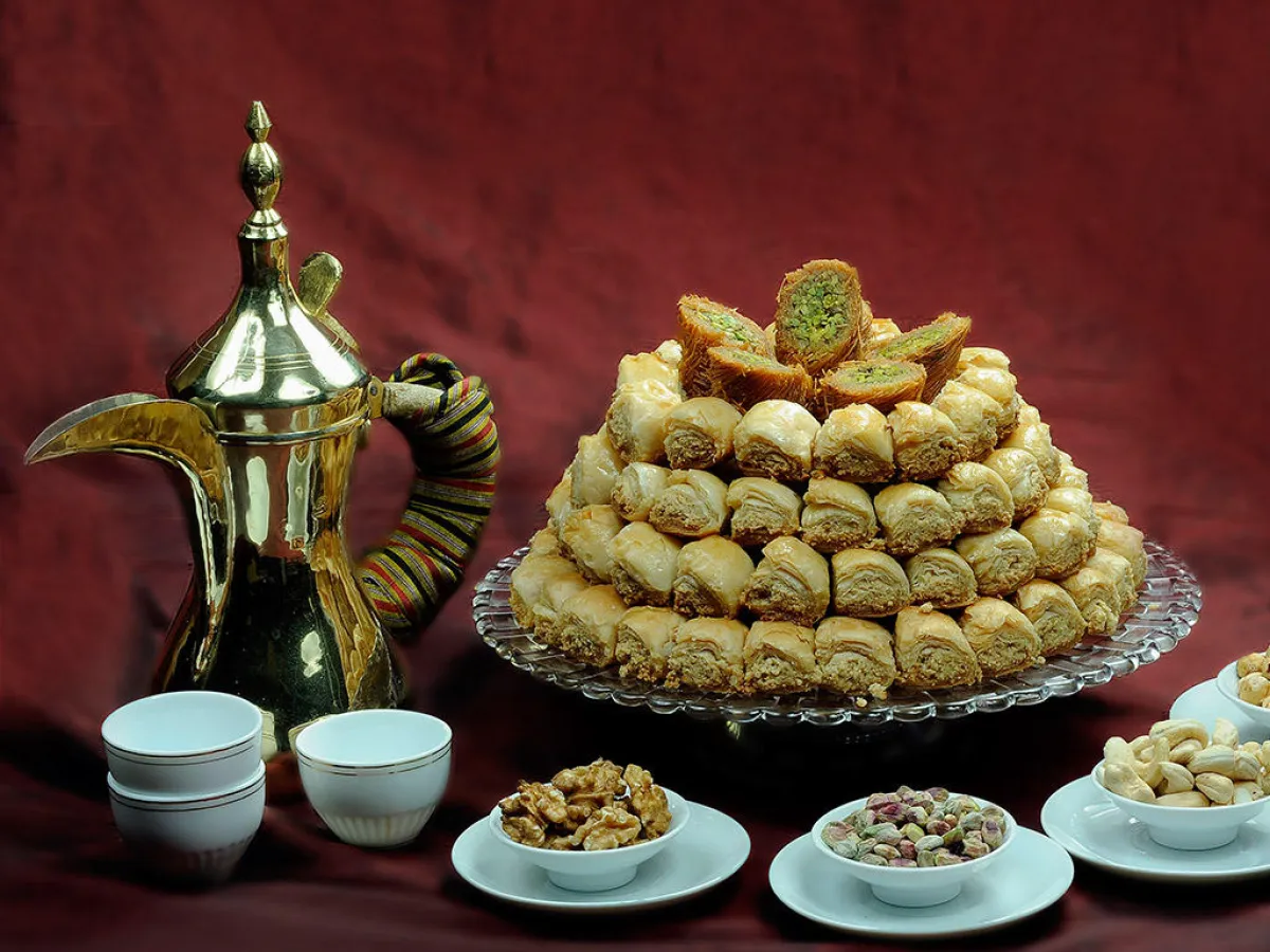 4 ـ يُسكب القطر على حبّات البقلاوة على الفور، وتترك حتى تبرد إلى حين التقديم.