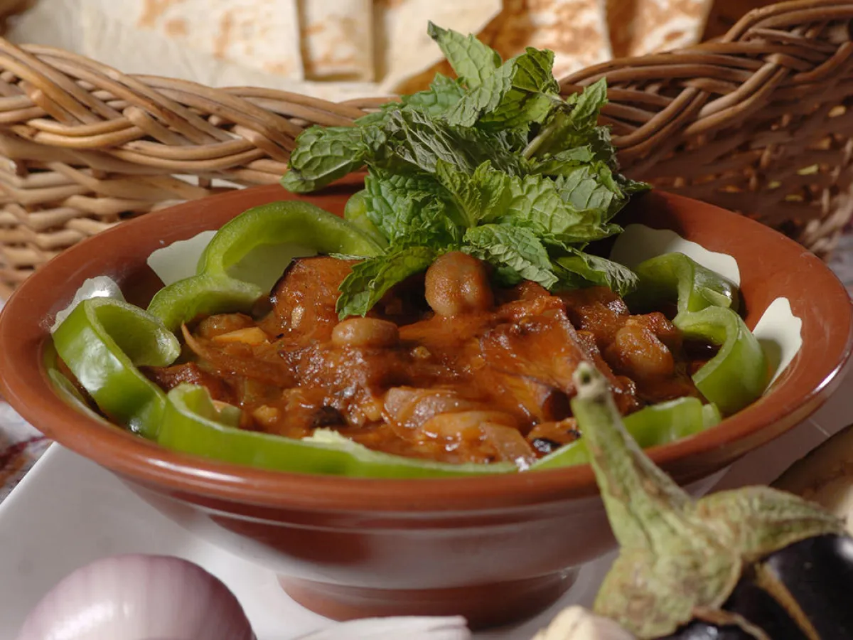 5ـ يضاف الحمص والباذنجان، ويستمرّ في الغليان ببطء لمدة 15 دقيقة، حتى يلين المزيج. ينثر مسحوق القرفة والبهارات.