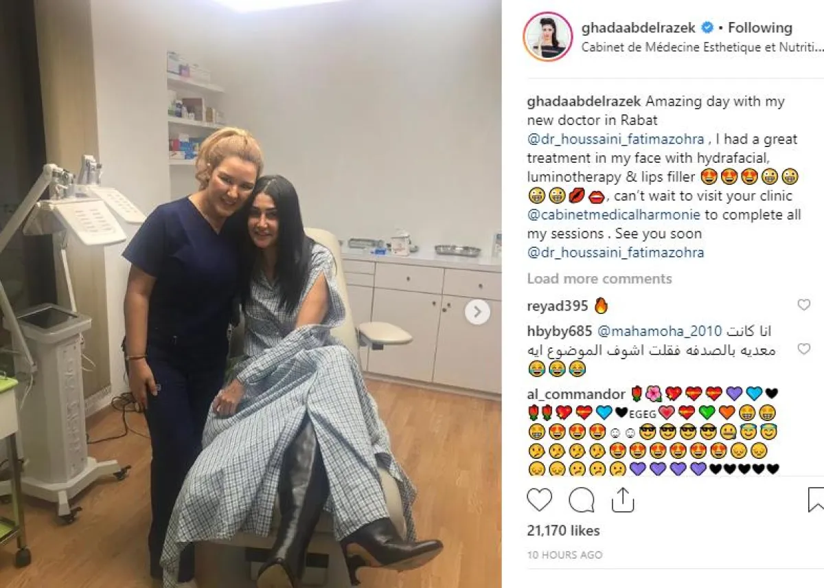 غادة نشرت وقائع عملية التجميل بالكامل، وعلقت عليها قائلة: قضيت يوم مدهش مع طبيبتي الجديدة في الرباط فاطيما ، و تلقيت معاملة رائعة، أثناء عمل ترطيب للوجه بالضوء، وعمل فيلر للشفايف بأحدث التقنيات، كل الشكر.