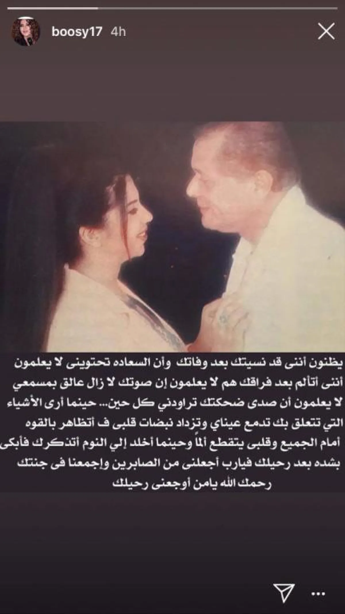 بوسي نشرت صورة تجمعها بزوجها الراحل محمد عبد العزيز عبر خاصية "ستوري" بموقع انستقرام، وعلقت عليها قائلة: يظنون أنني قد نسيتك بعد وفاتِك، وأنّ السعادة تحتويني، لا يعلمون أنني أتألم بعد فراقِك، هم لا يعلمون أنّ صوتك لازال عالقًا بمسمعي، لا يعلمون أنّ صدى ضحكتِك تراودني كلّ حين.