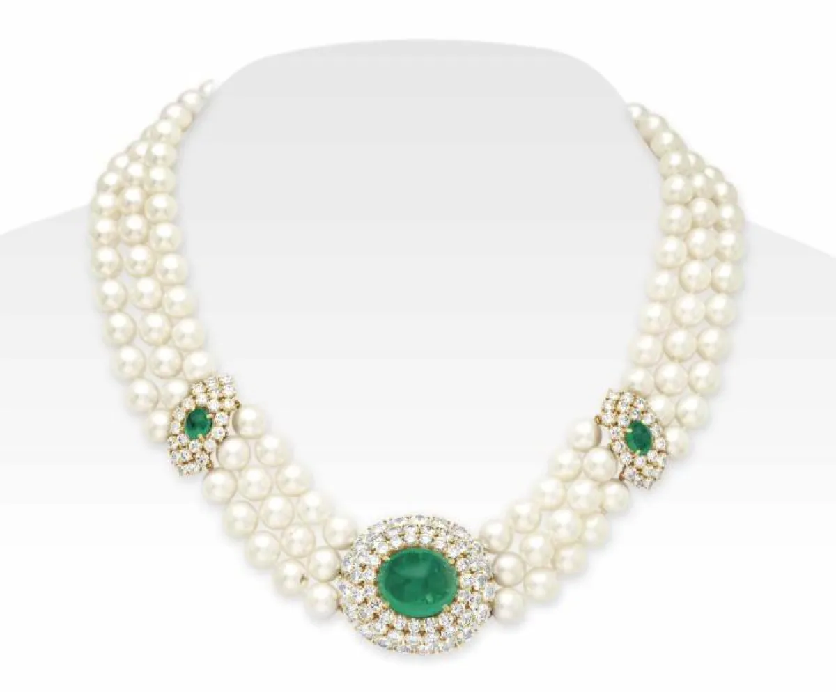 ويمكن أن تكون القلادة الذهبية مرصعة بالألماس وتتدلى منها حبّات اللؤلؤ مثل قلادات فان كليف آند آربلز Van Cleef & Arpels وكارتييه Cartier.